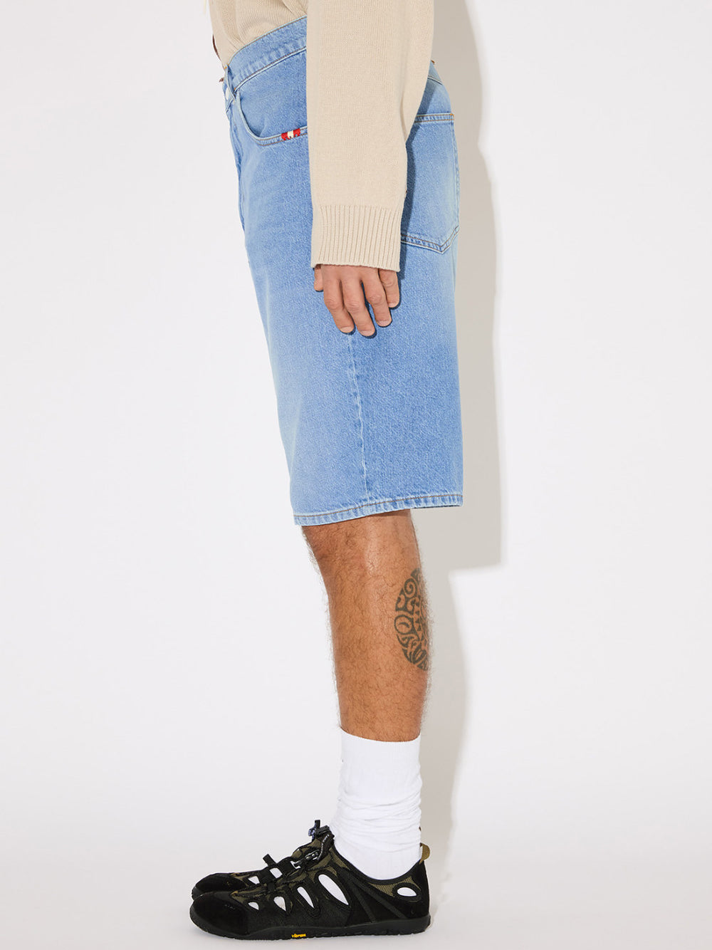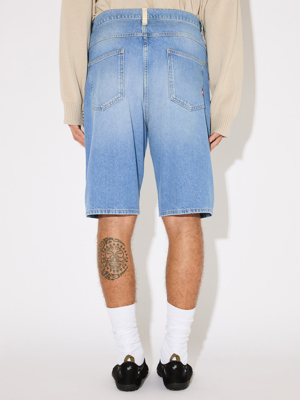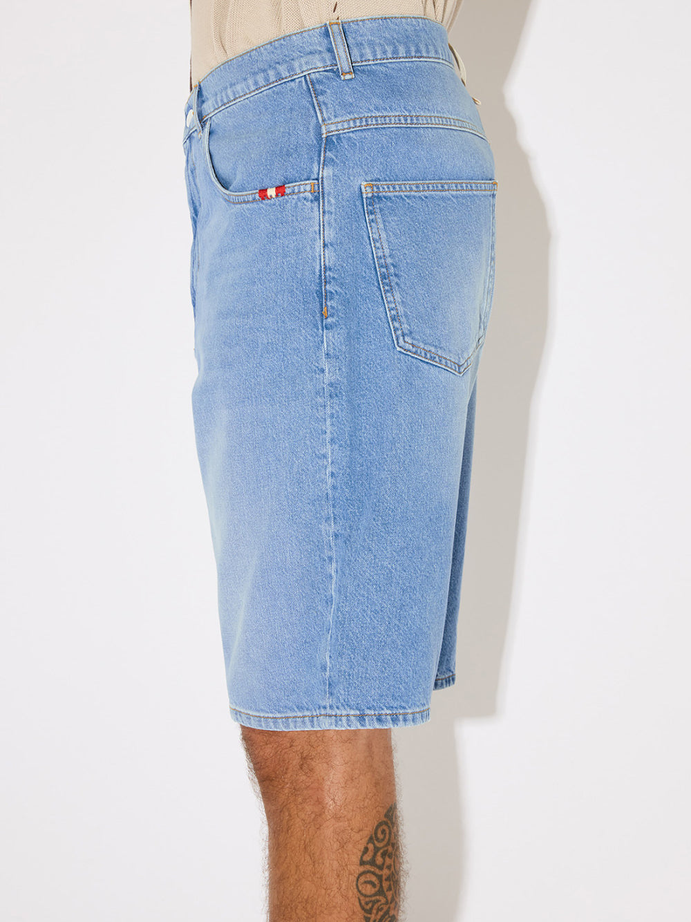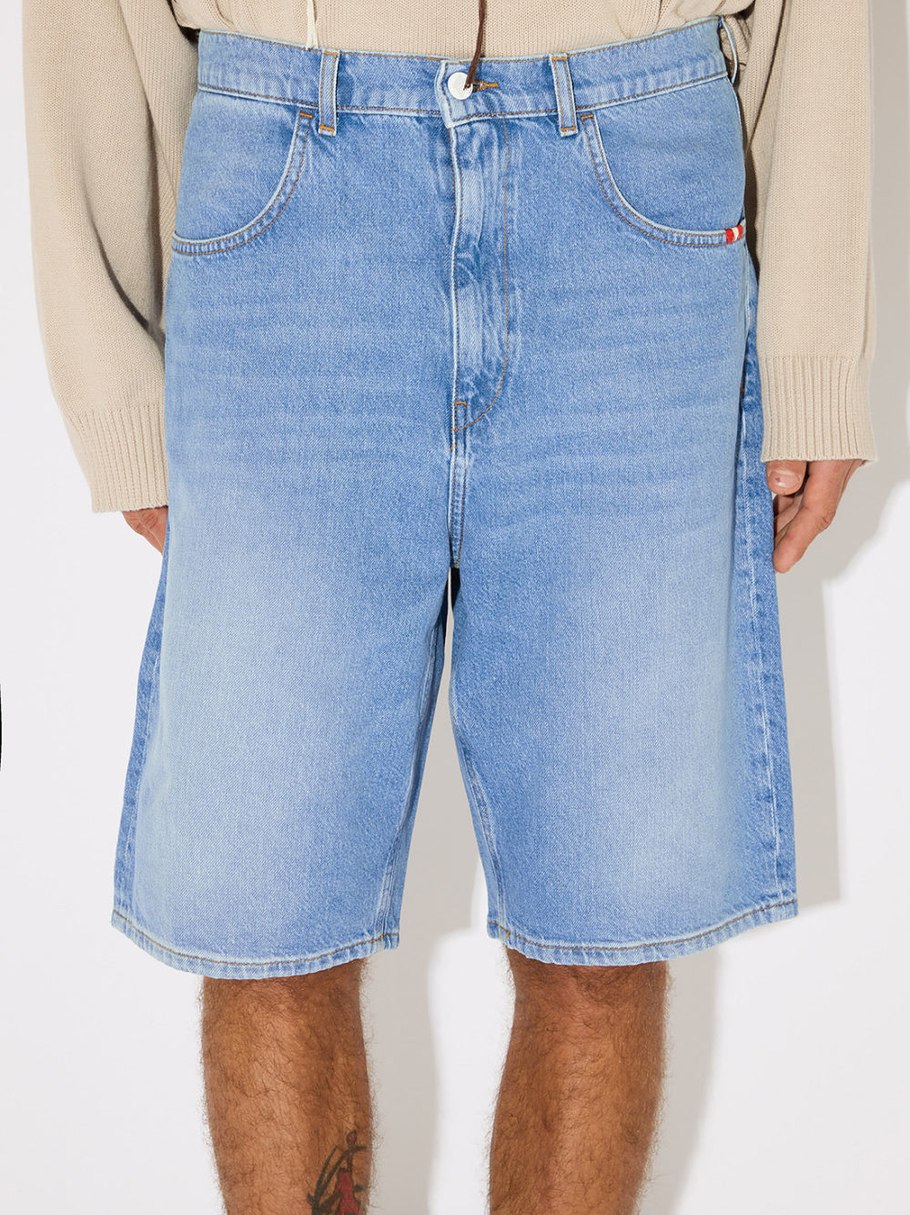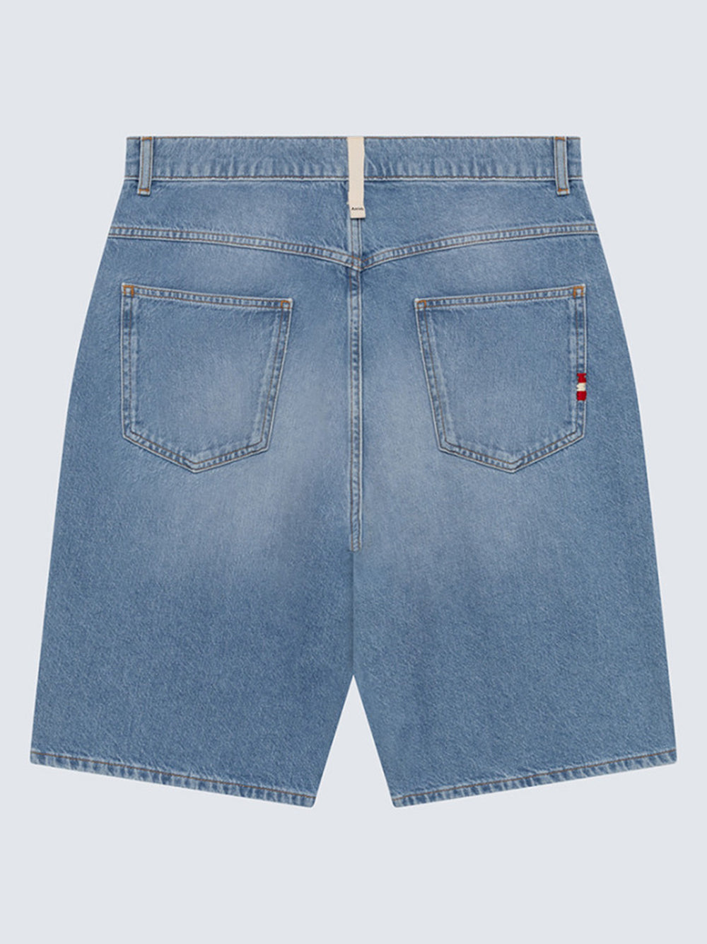 Light denim bermuda shorts with a faded wash and relaxed fit. Mid-rise silhouette features belt loops, button and zip closure, and an iconic logo fabric loop on the back. Four functional pockets with contrasting thread embroidery details. Subtle worn-in effect for an effortlessly cool look.