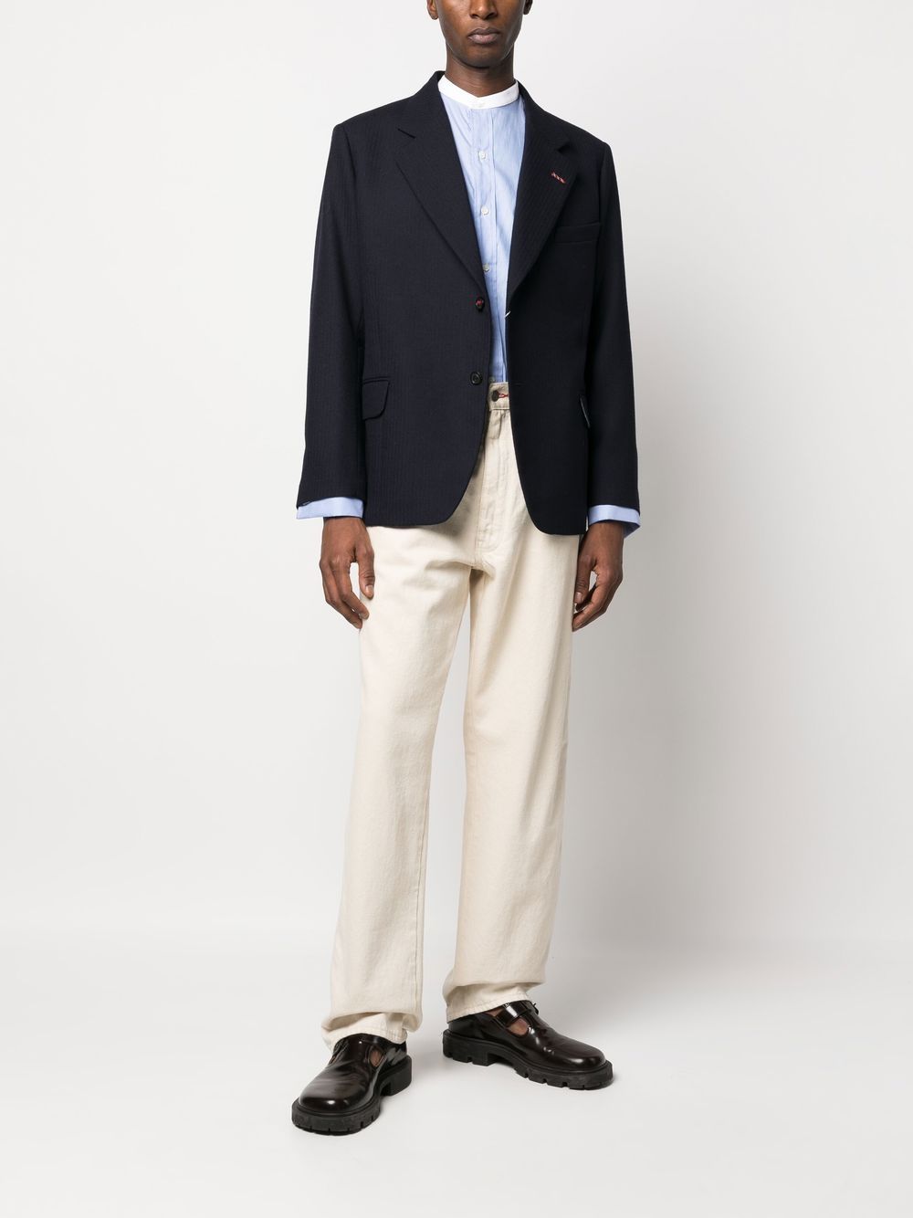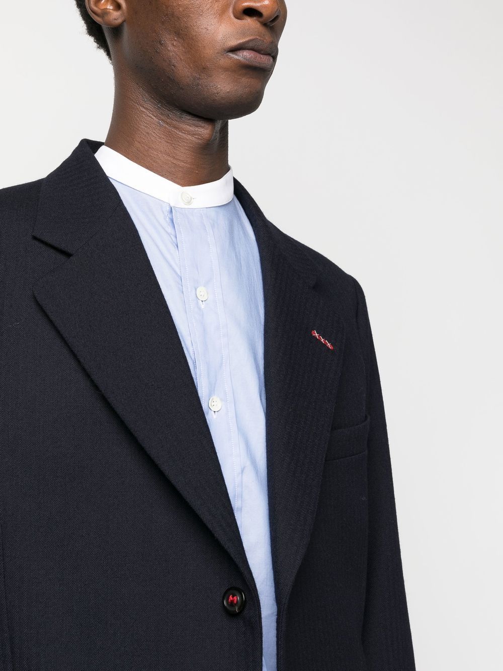 Step out in style with our midnight blue, single-breasted wool blazer. Made from a luxurious blend of wool and cotton, this blazer features classic notched lapels and long sleeves, perfect for any occasion. The front button fastening adds a touch of sophistication, while our signature four-stitch logo makes a subtle statement. Upgrade your wardrobe with this must-have piece.