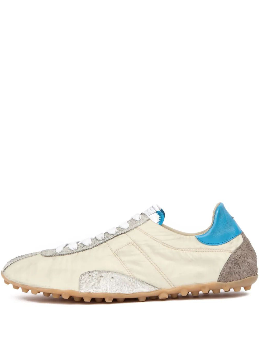 Step into style and comfort with our SPRINTERS LOW TOP sneakers! Made in Italy with a light beige color and front lace-up fastening, these kicks are perfect for any casual outfit. The rubber sole provides durability while the color-block panelled design adds a unique touch. Show off your playful side with our signature single-stitch logo.