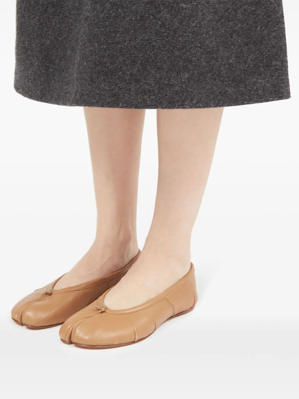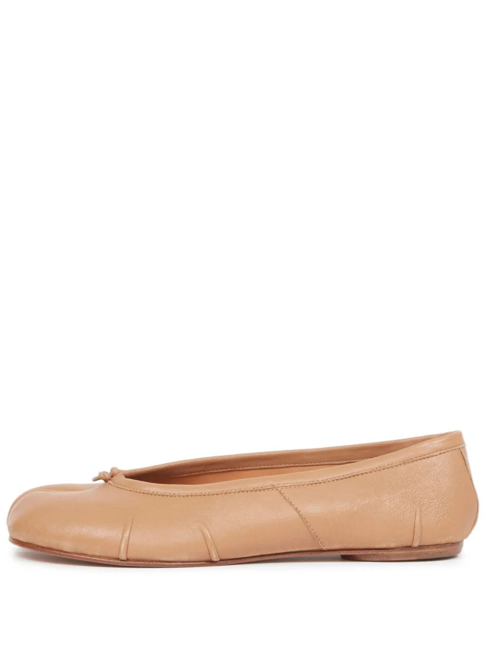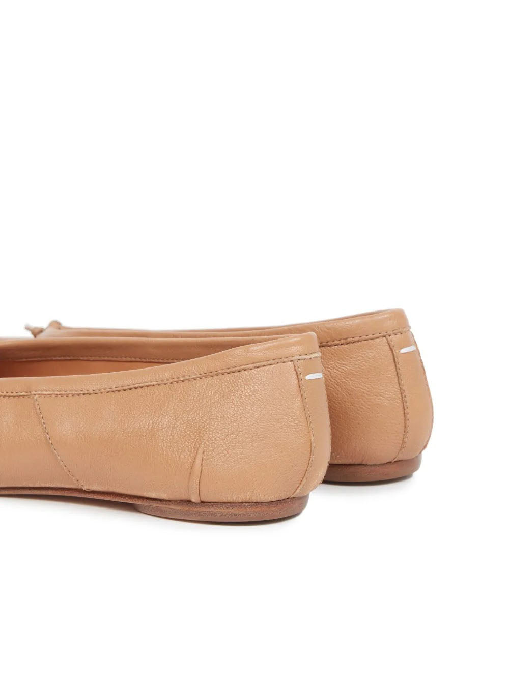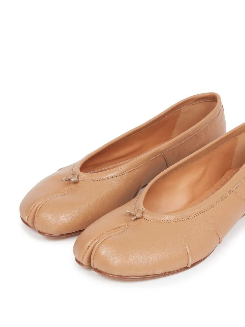 Complete your outfit with these unique TABI NEW BALLERINA shoes. Made with soft nappa leather and handmade pleats, each pair features a playful cotton knot and white stitching on the back. The iconic Tabi toe adds an unexpected touch, while the Maison Margiela logo on the sole showcases the brand's signature style. Perfect for adding a touch of coolness to any look. Available in beige.