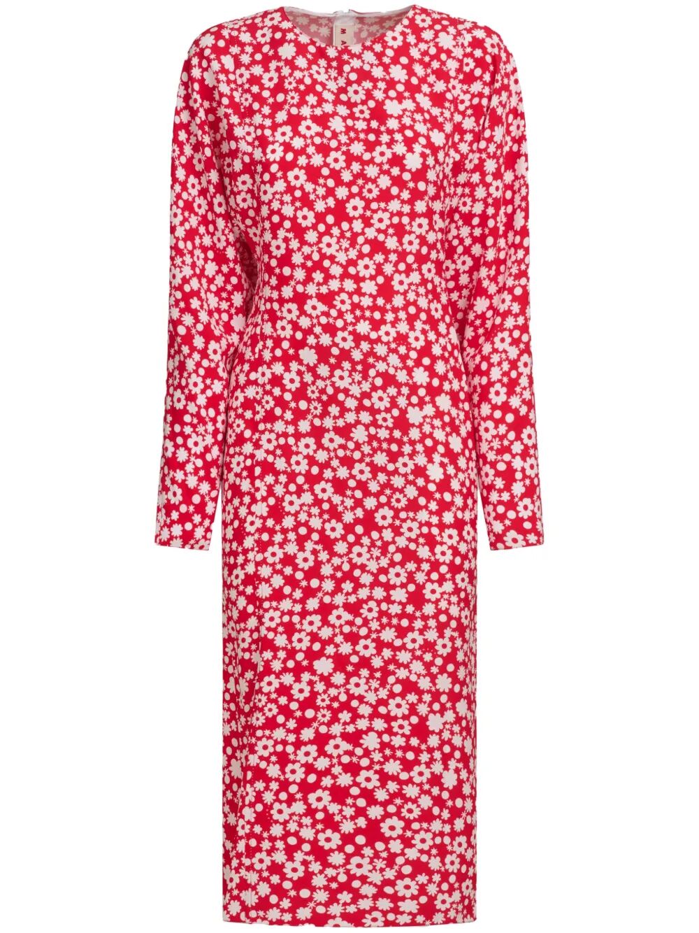 This midi dress is made from sustainable enver satin and features a bold seasonal print. The pencil silhouette, long sleeves, and round neckline give it an elegant touch, while the back slit adds a hint of playfulness. Plus, it's made in Italy. Available in red.