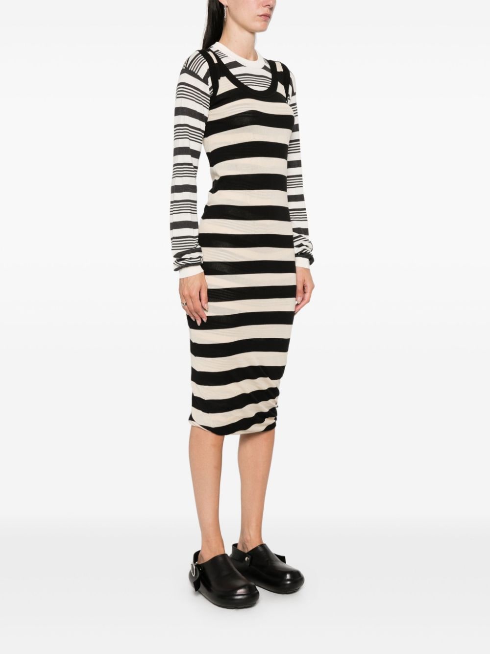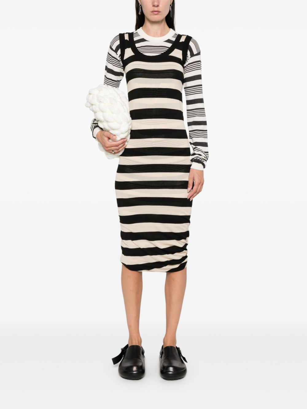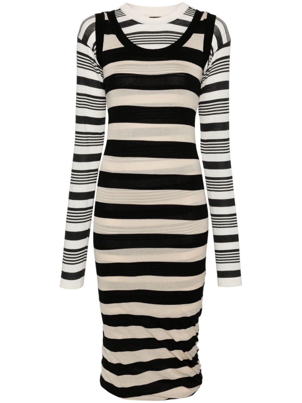 Get ready to make a statement in our light beige and black striped midi dress. Made from a soft cotton fine knit, this dress features a unique layered design with a crew neck and puffball hem. With long sleeves and ribbed cuffs, this mid-length dress is perfect for any occasion.