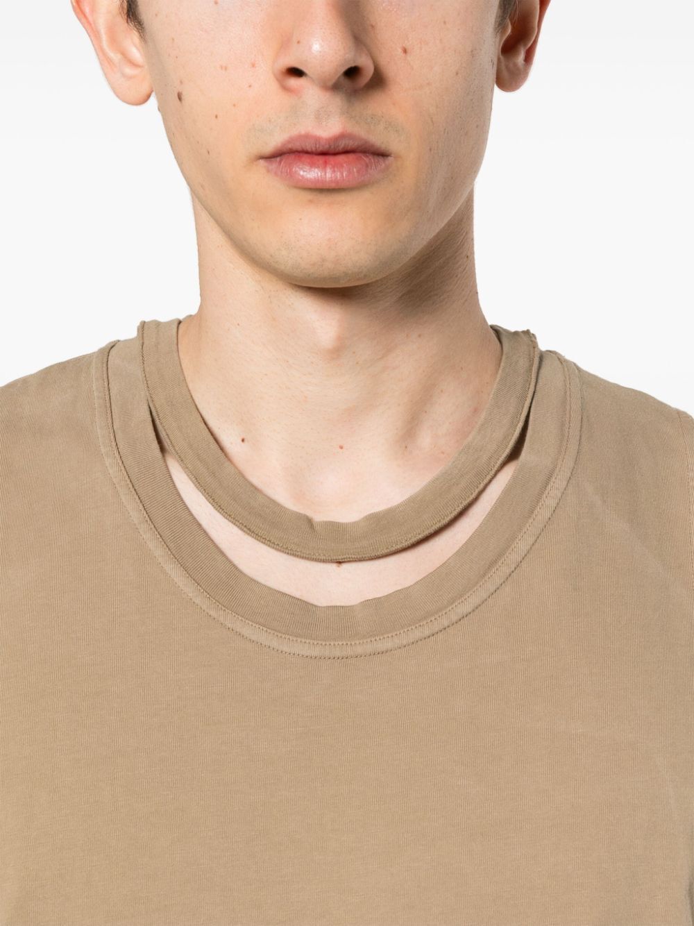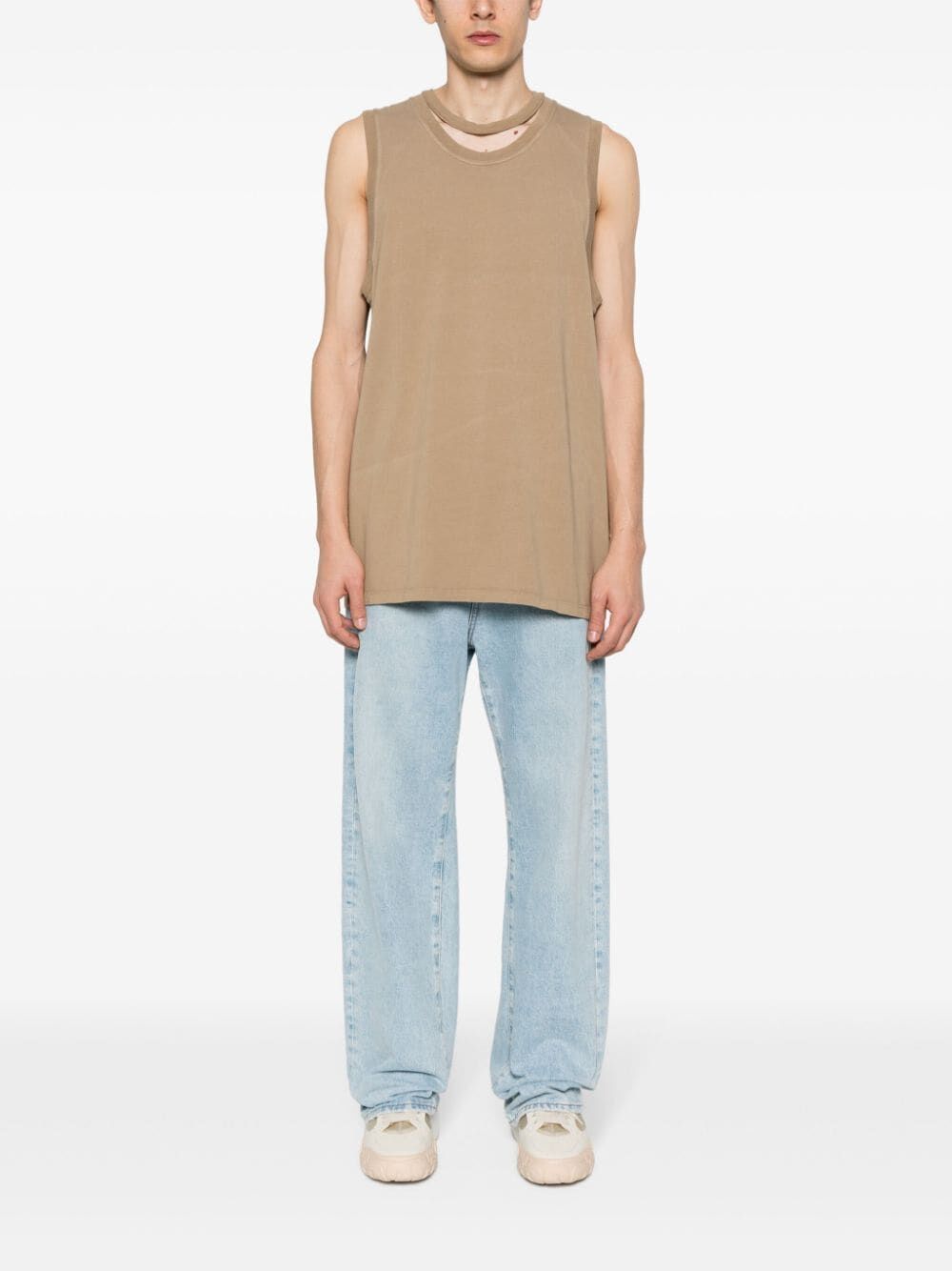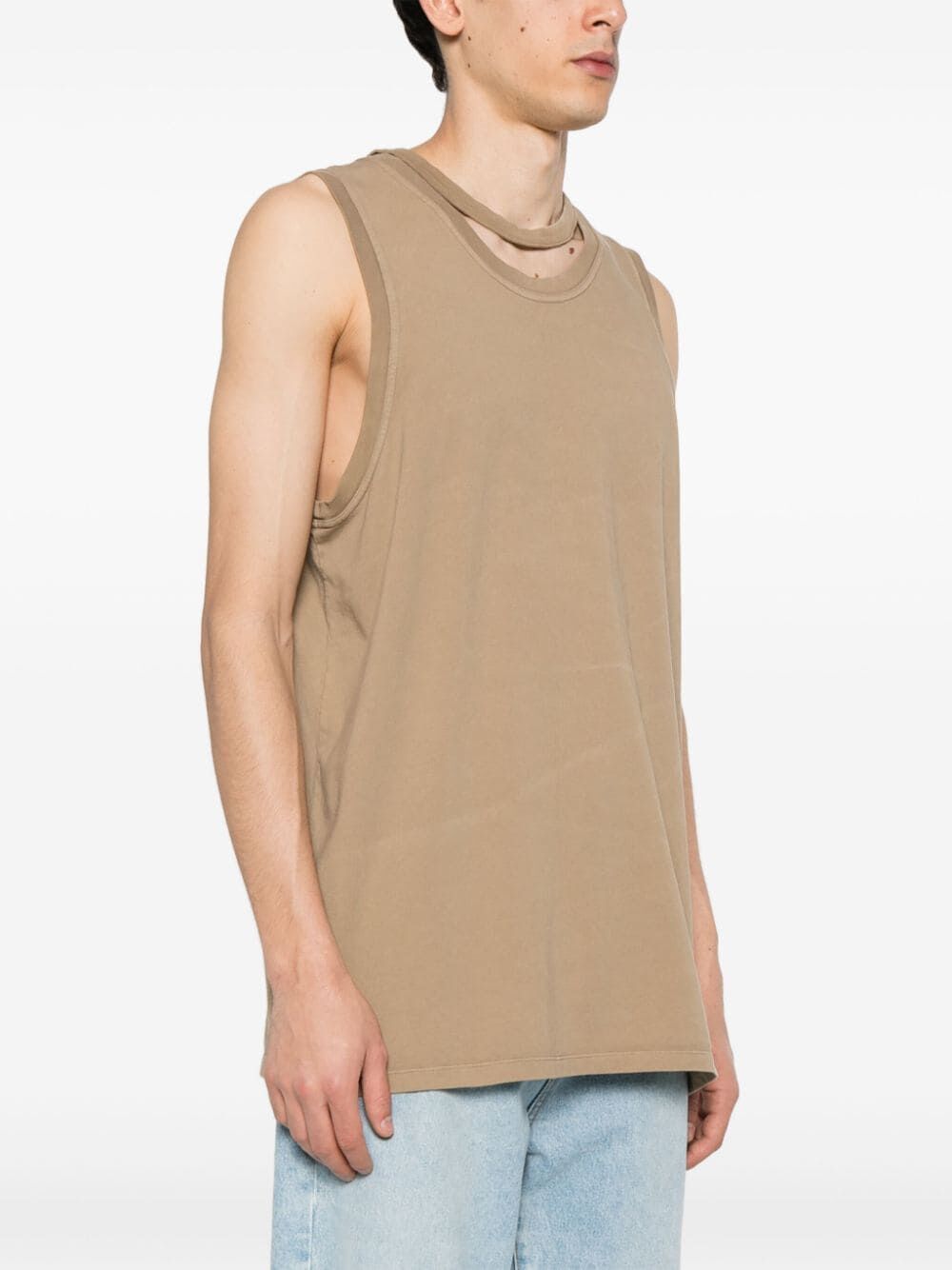 Stay cool with the HUGO tank top. Its camel brown color and cotton fabric offers comfort while the jersey texture and cut-out detailing adds a touch of edginess. With a round neck and sleeveless design, this top is perfect for any casual occasion. Don't miss out on this trendy piece.