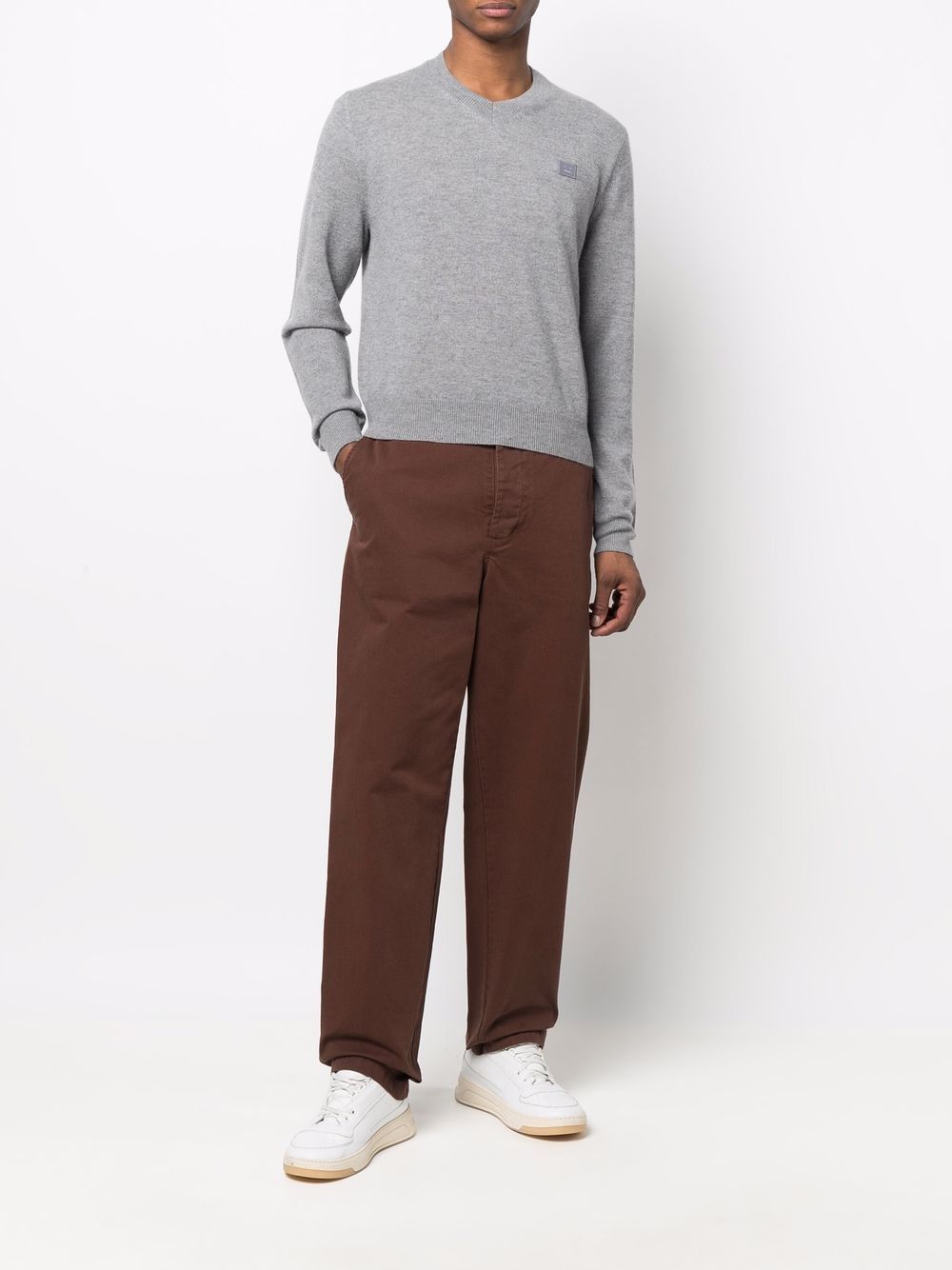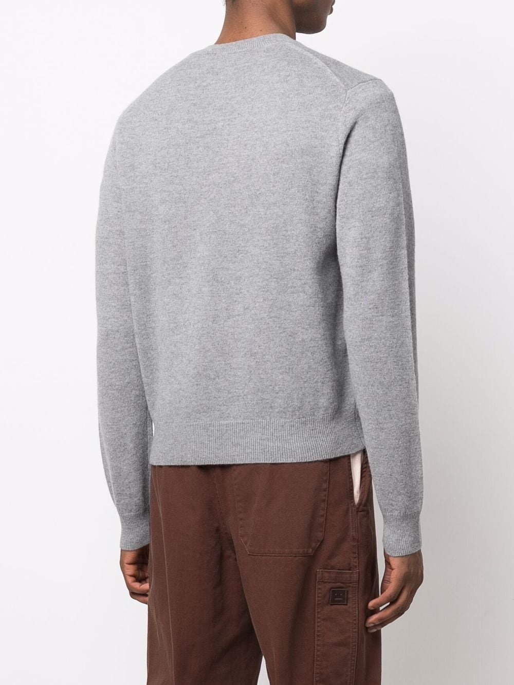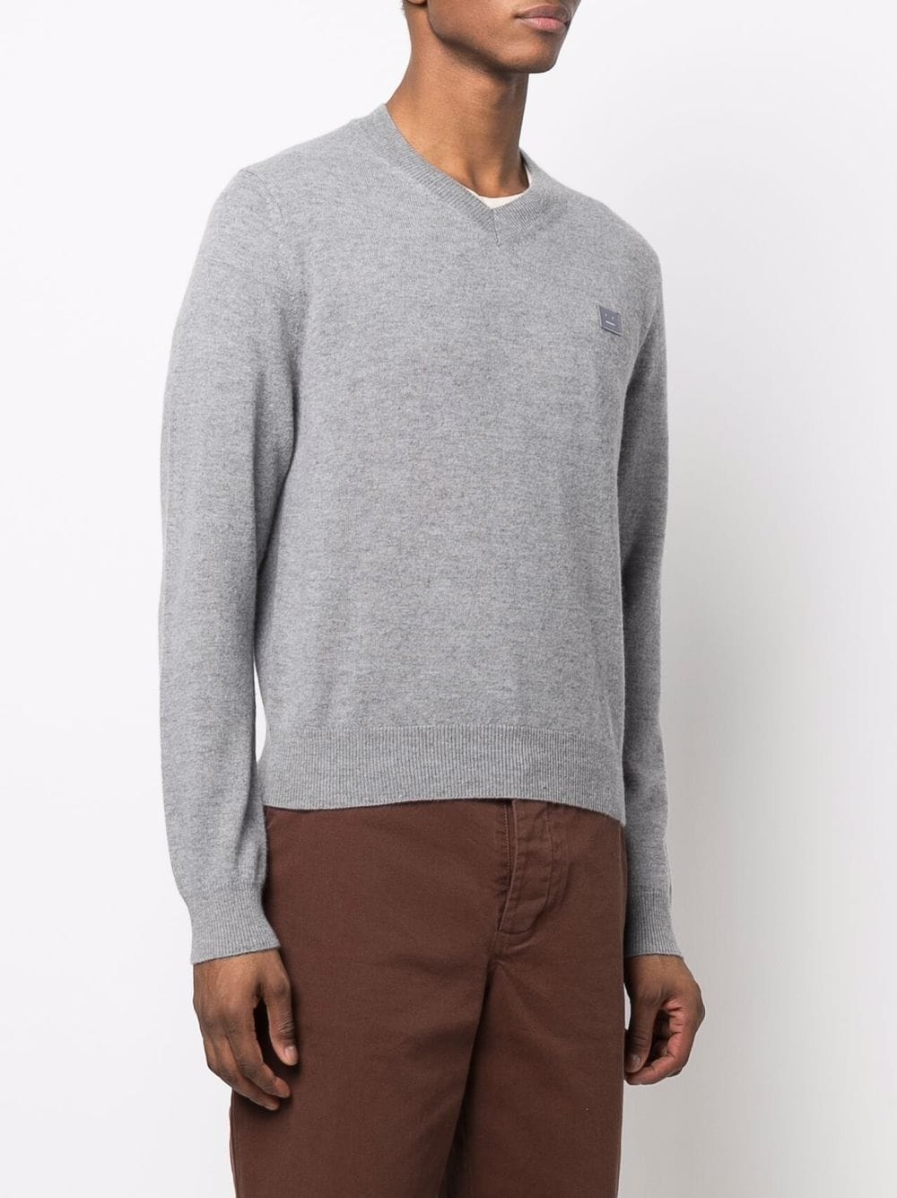 Elevate your sweater game with FACE SWEATER. This grey v-neck features the iconic acne face logo, giving you an effortlessly cool and trendy look. Plus, the cozy black color is perfect for any weather.