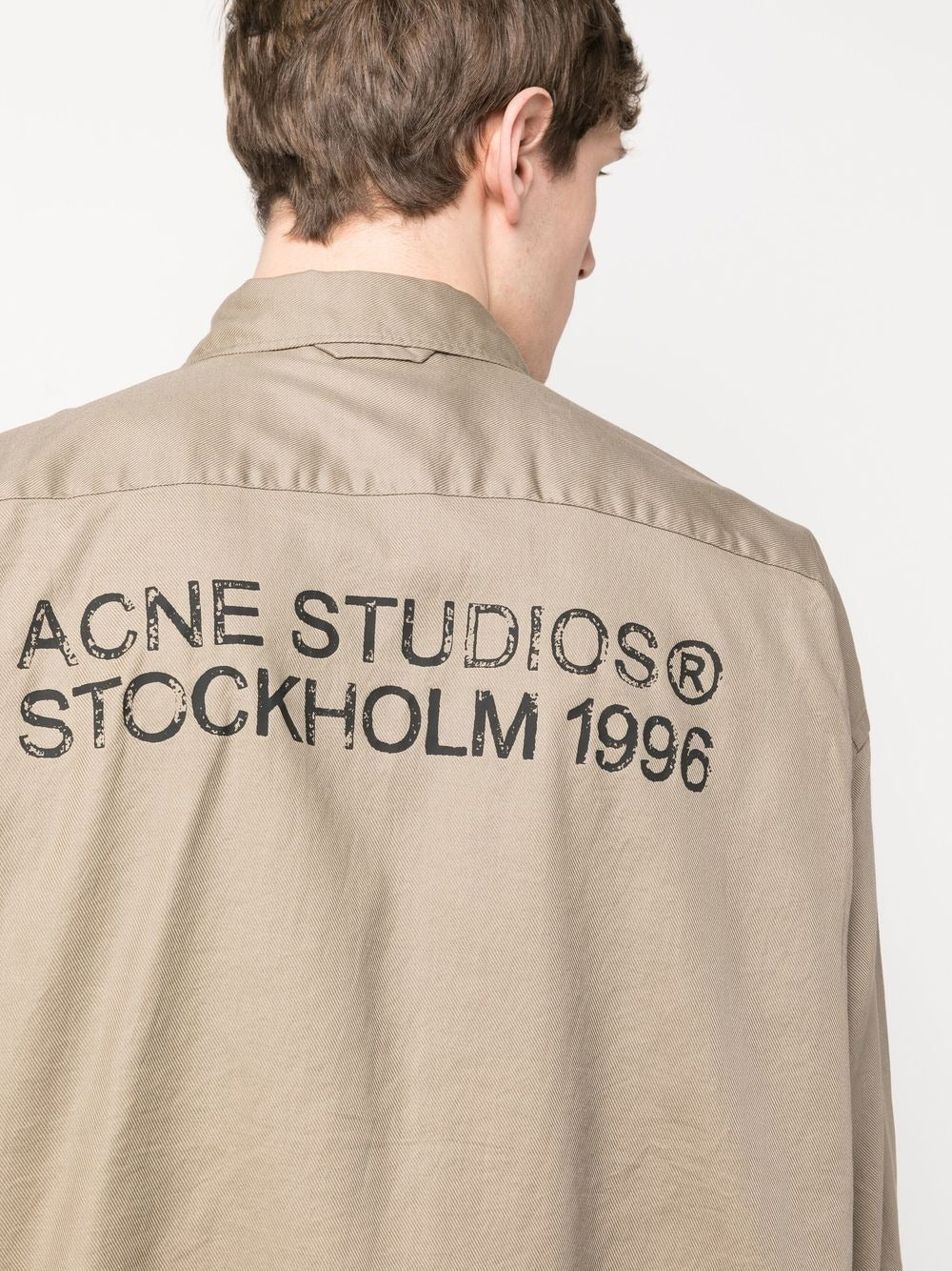 Stay stylish with this beige Acne Studios shirt featuring a logo on the back and front pockets. Perfect for any occasion, this button-up shirt adds a touch of quirky fun to your wardrobe. Make a statement with this unique, printed shirt that combines fashion and comfort.