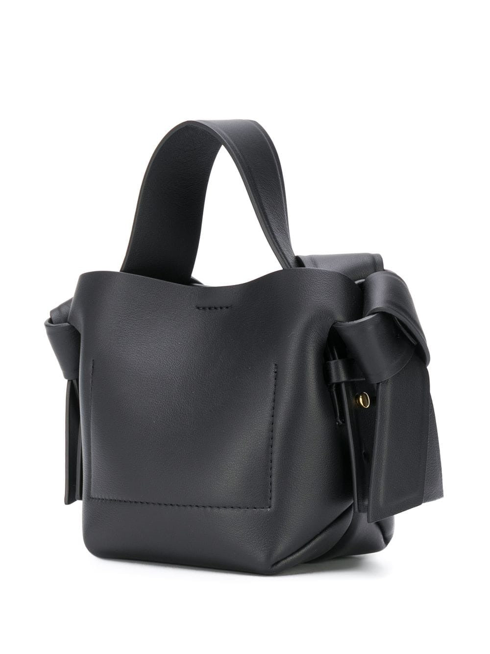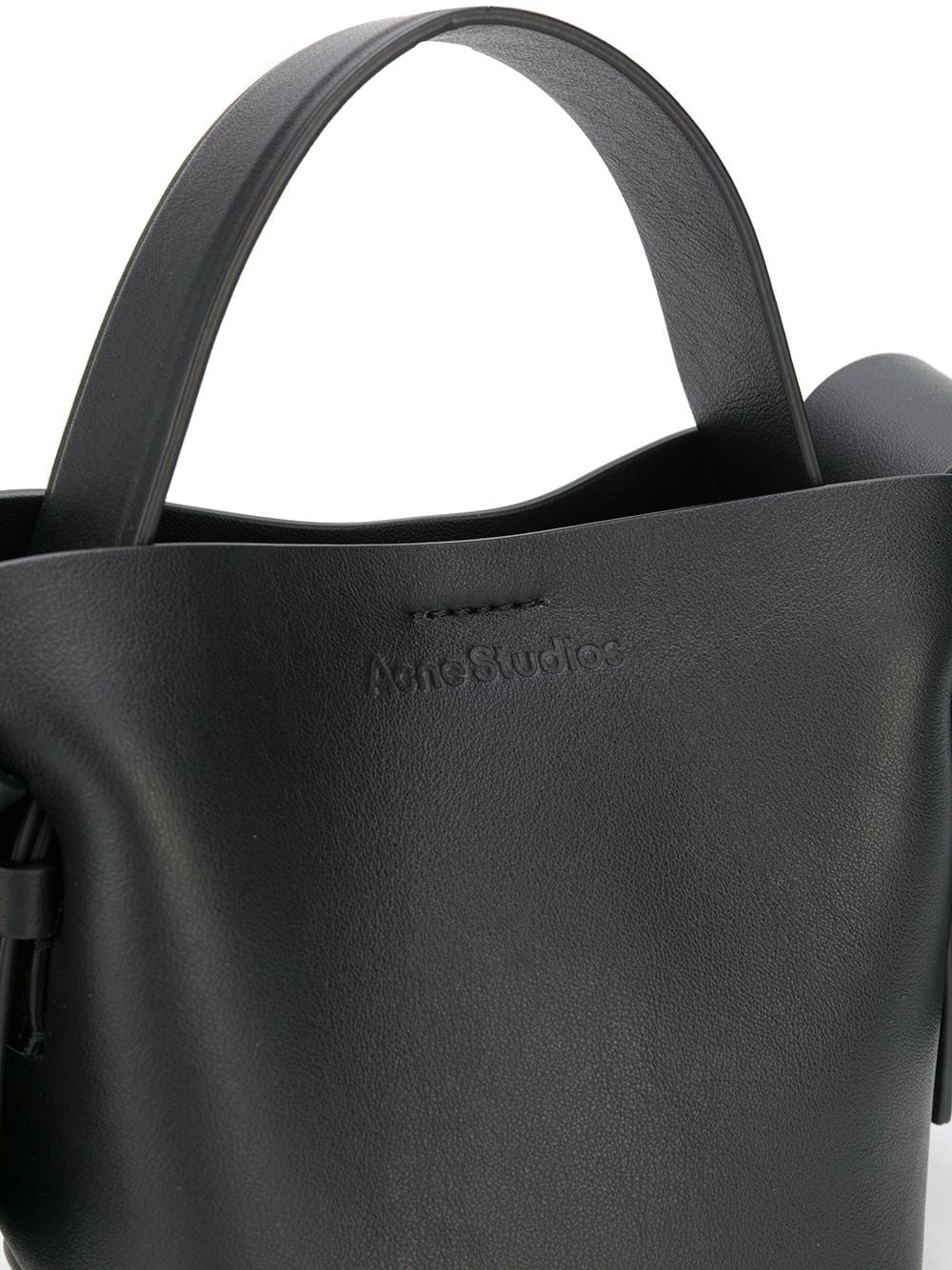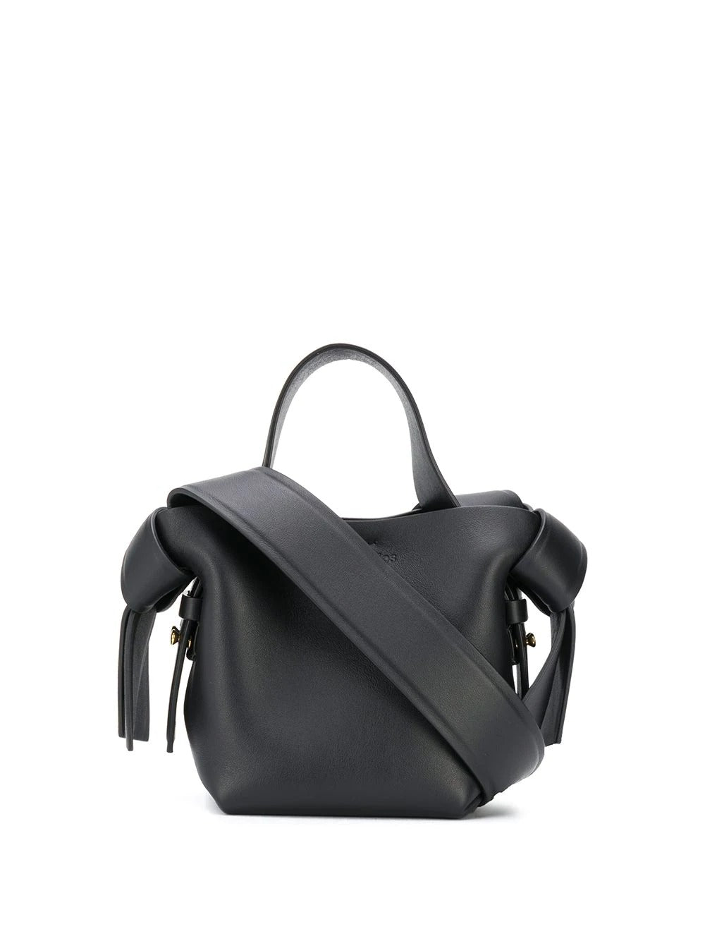 Introducing the black Musubi micro tote - a quirky take on a traditional Japanese obi sash. Crafted from soft leather, this bag features twisted musubi knots and a debossed Acne Studios logo. With a top handle, detachable shoulder strap, and spacious interior compartment, this tote is both stylish and functional. Made in Italy and includes a protective dustbag. Measurements: 12 cm x 13 cm x 10 cm; Strap measurements: 130 cm full length.