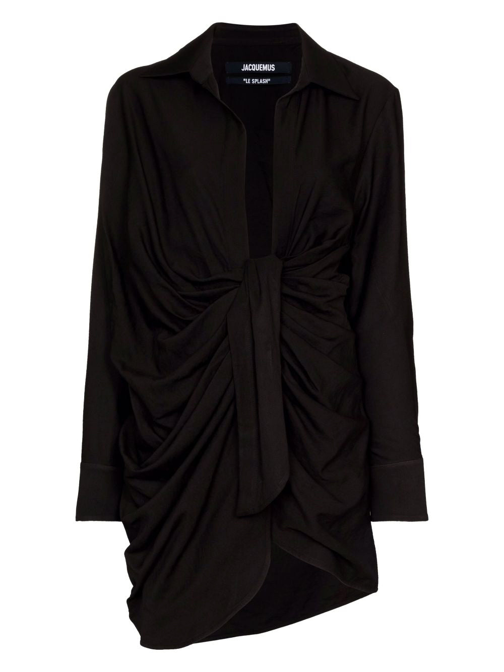 Be effortlessly chic in LA ROBE BAHIA. With a relaxed fit and textured blended viscose fabric, this dress features a pointed collar and plunging draped neckline. A hidden button under the sewn knot adds a touch of intrigue, while the square cuffs and mother-of-pearl buttons add a touch of elegance. Available in black.