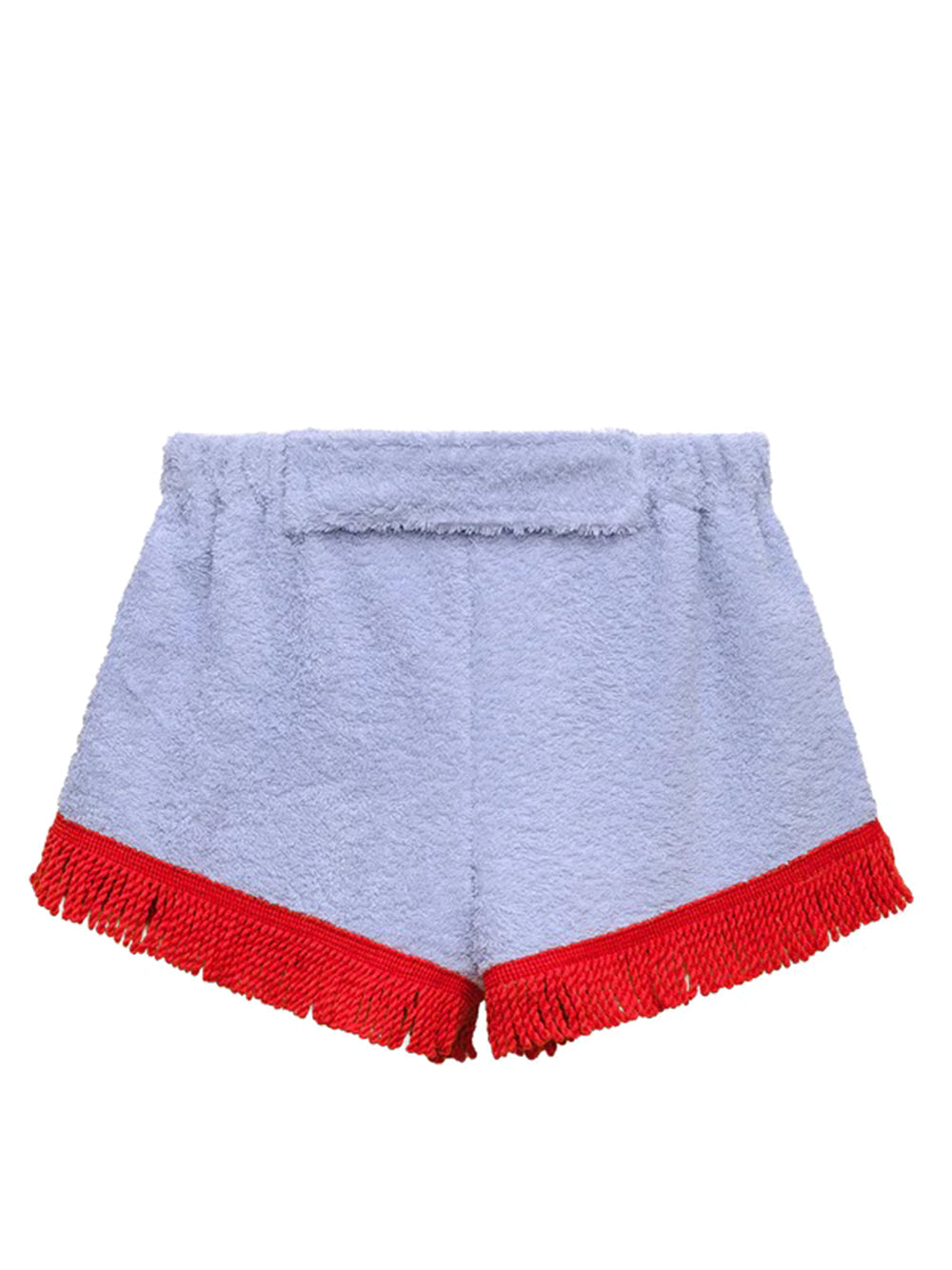 Introducing the WILD SUMMER PANTS - the perfect blend of style and functionality. Made from soft light blue cotton, these towel shorts feature playful red fringes and a comfortable regular fit. The mid-rise and elasticated waistband with velcro fastening ensure a perfect fit for any summer adventure.