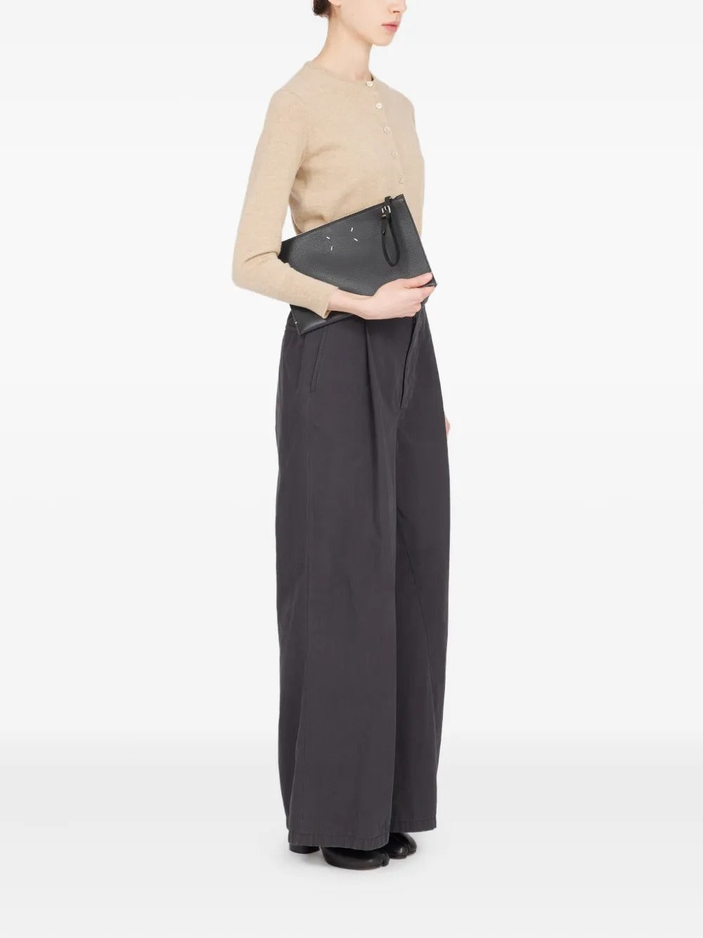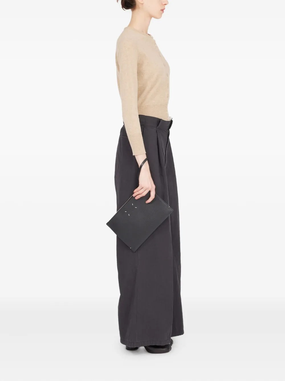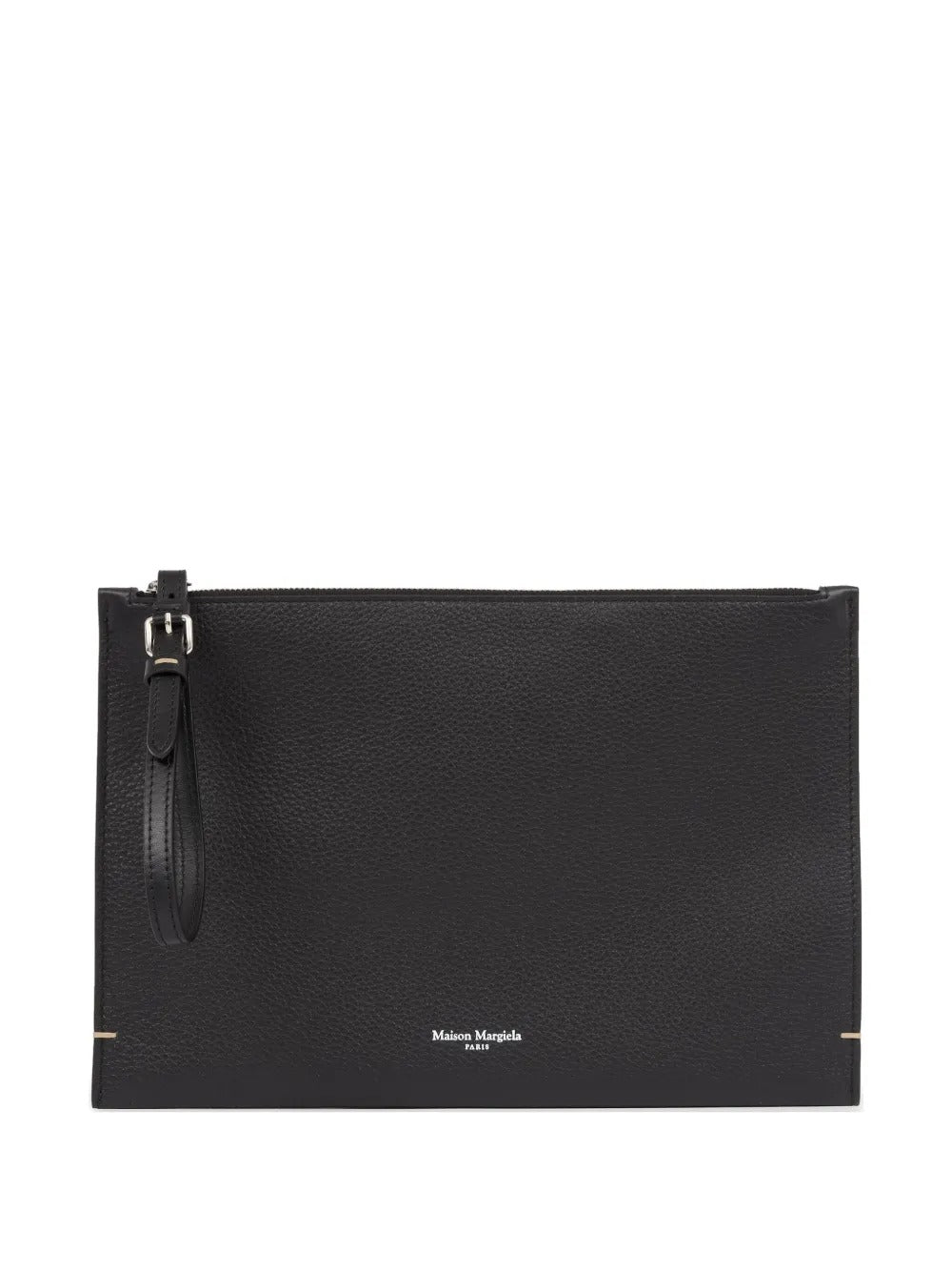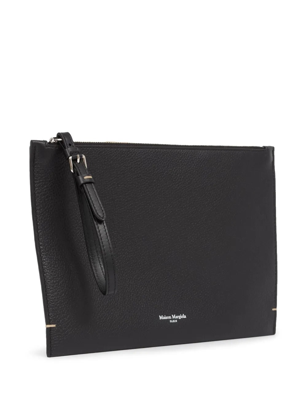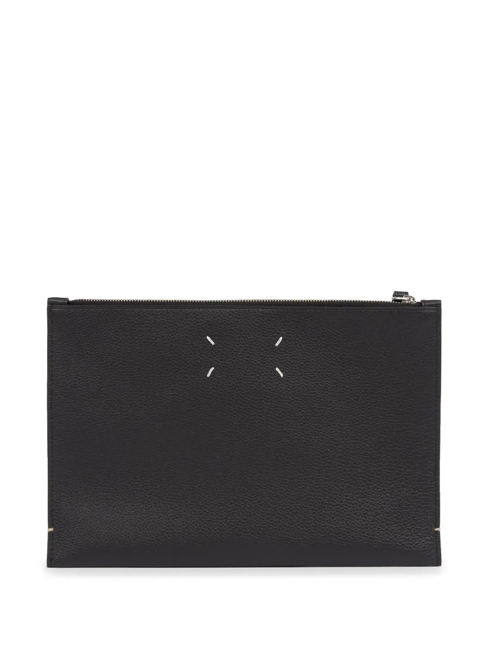 Stay organized and stylish with this sleek black pouch featuring a convenient zip fastening and silver-tone logo lettering. With a signature four-stitch logo and loop handle, it's the perfect on-the-go accessory for the fashion-forward individual. Keep your essentials secure and show off your coolness with this logo pouch.
