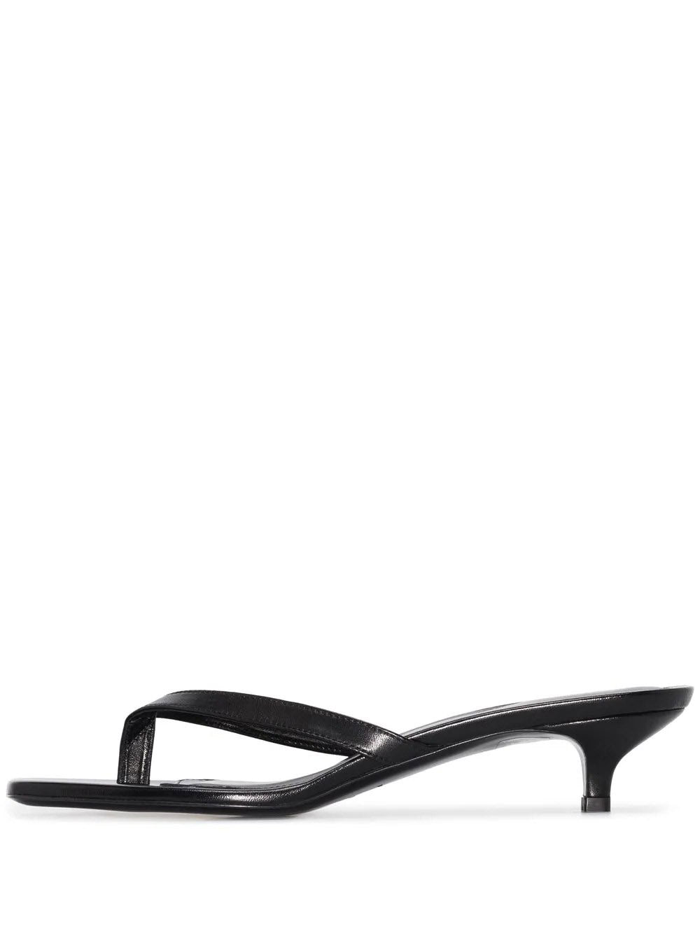 Elevate your summer style with TOTEME's Leather Heeled Flip Flops. Designed with a 1990s vibe, these black beauties feature a kitten heel silhouette and T-strap toe for a modern twist. Made in Italy from soft leather, they're perfect for adding a touch of playfulness to any outfit.