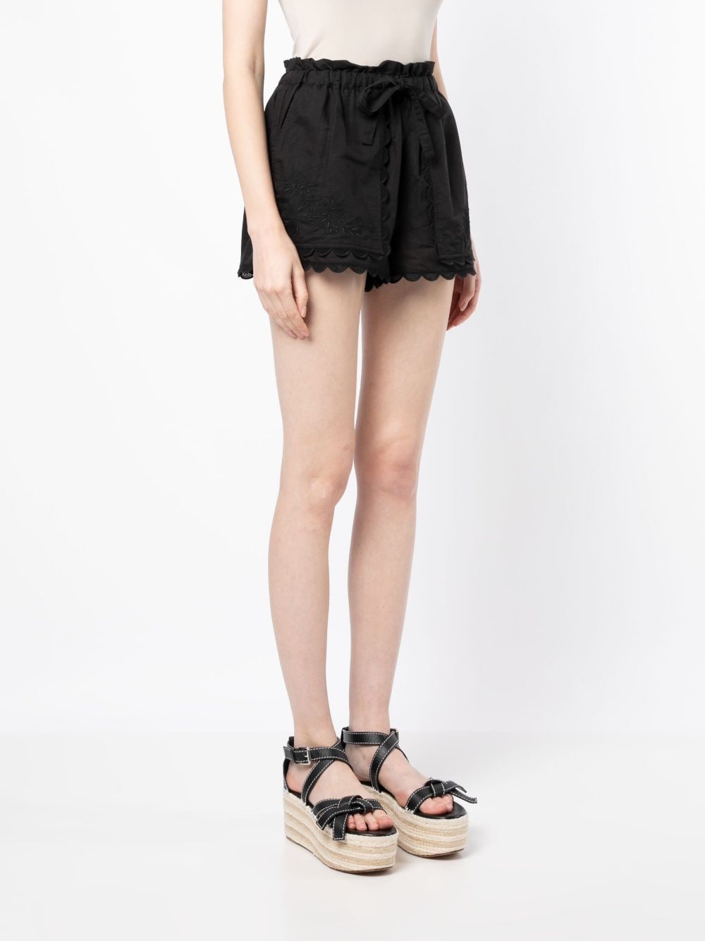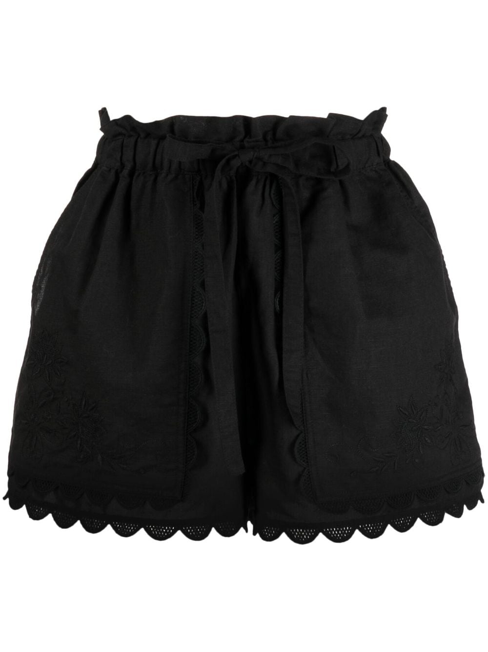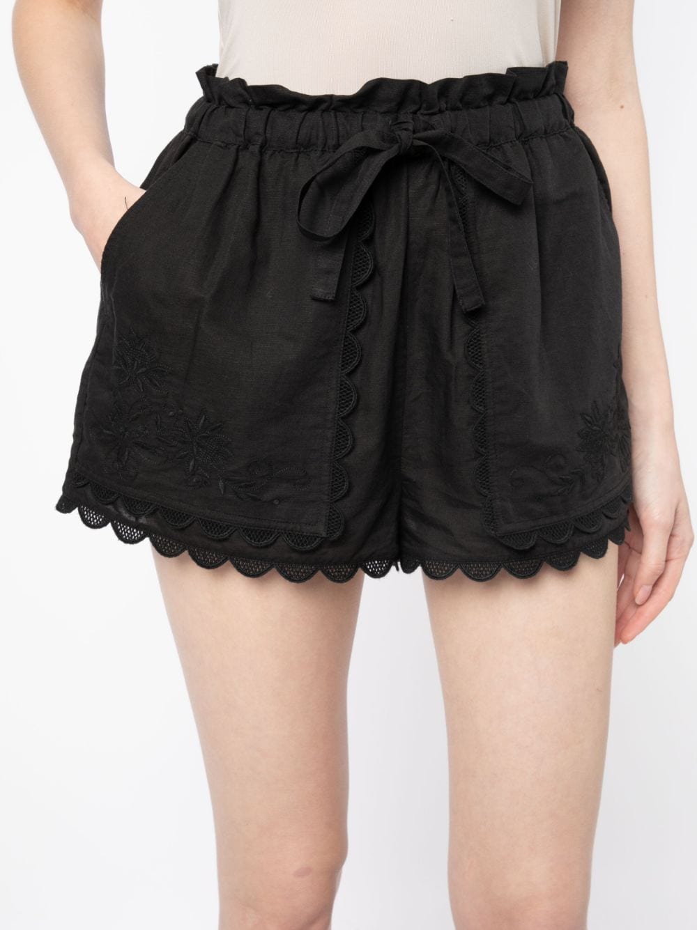 Elevate your summer wardrobe with our Nellie Shorts. Made from a durable cotton-linen blend, these thigh-length shorts feature an embroidered design and layered scallop edge for a playful touch. The ruched detailing, elasticated drawstring waistband, and two side pockets provide comfort and convenience. Available in black.