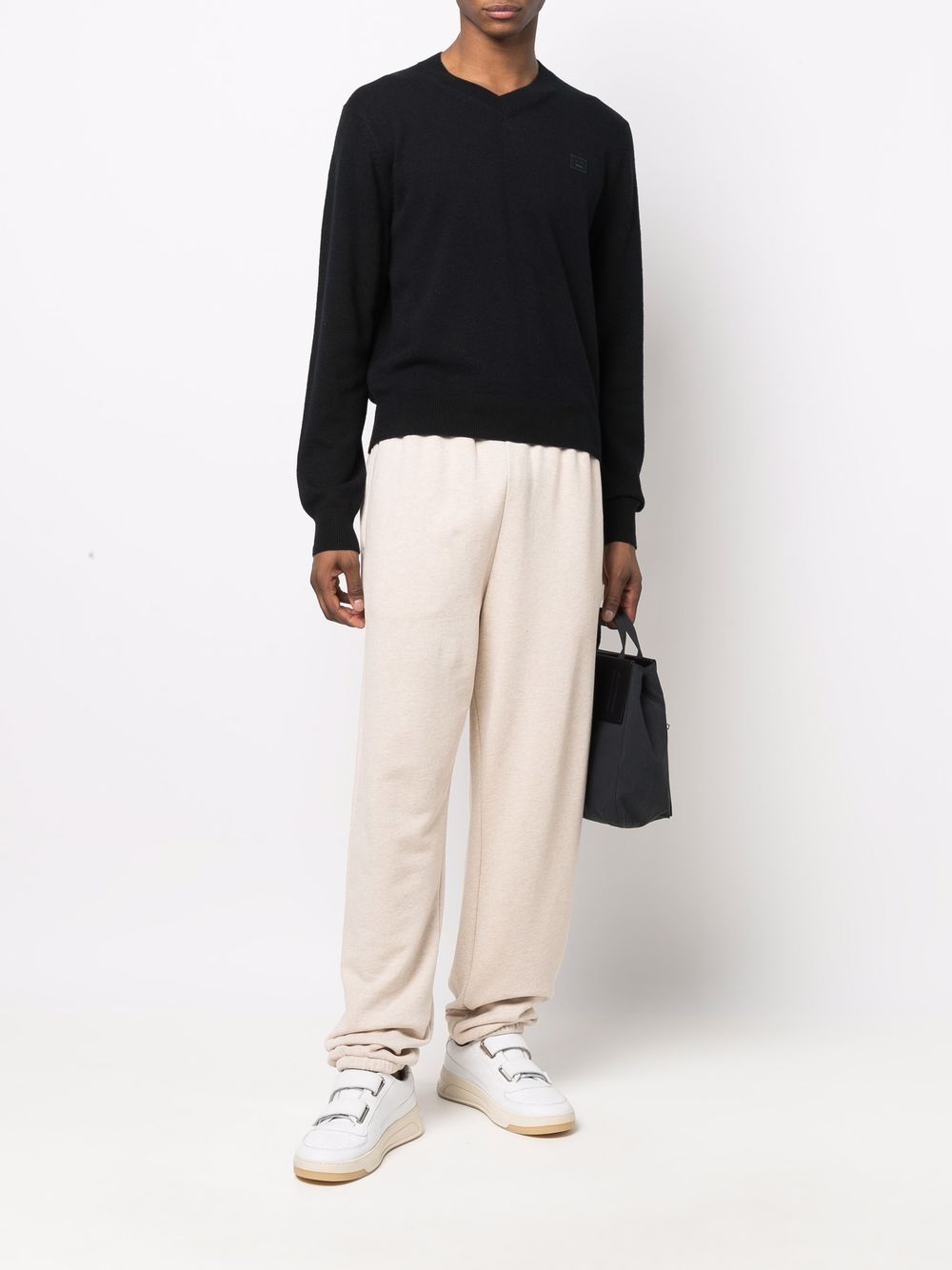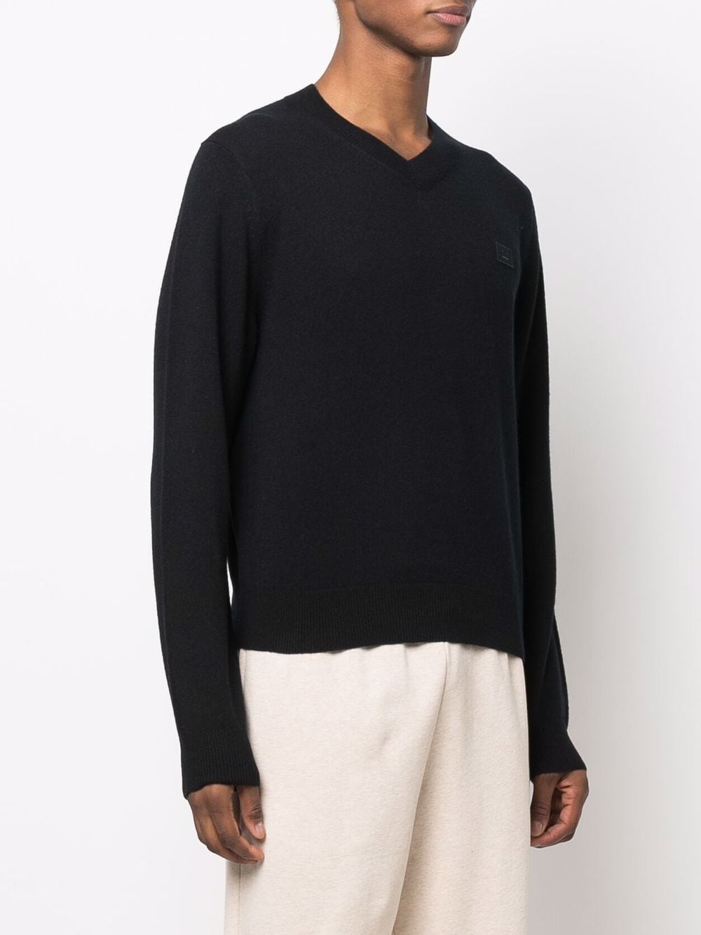 Elevate your sweater game with FACE SWEATER. This black v-neck features the iconic acne face logo, giving you an effortlessly cool and trendy look. Plus, the cozy black color is perfect for any weather.