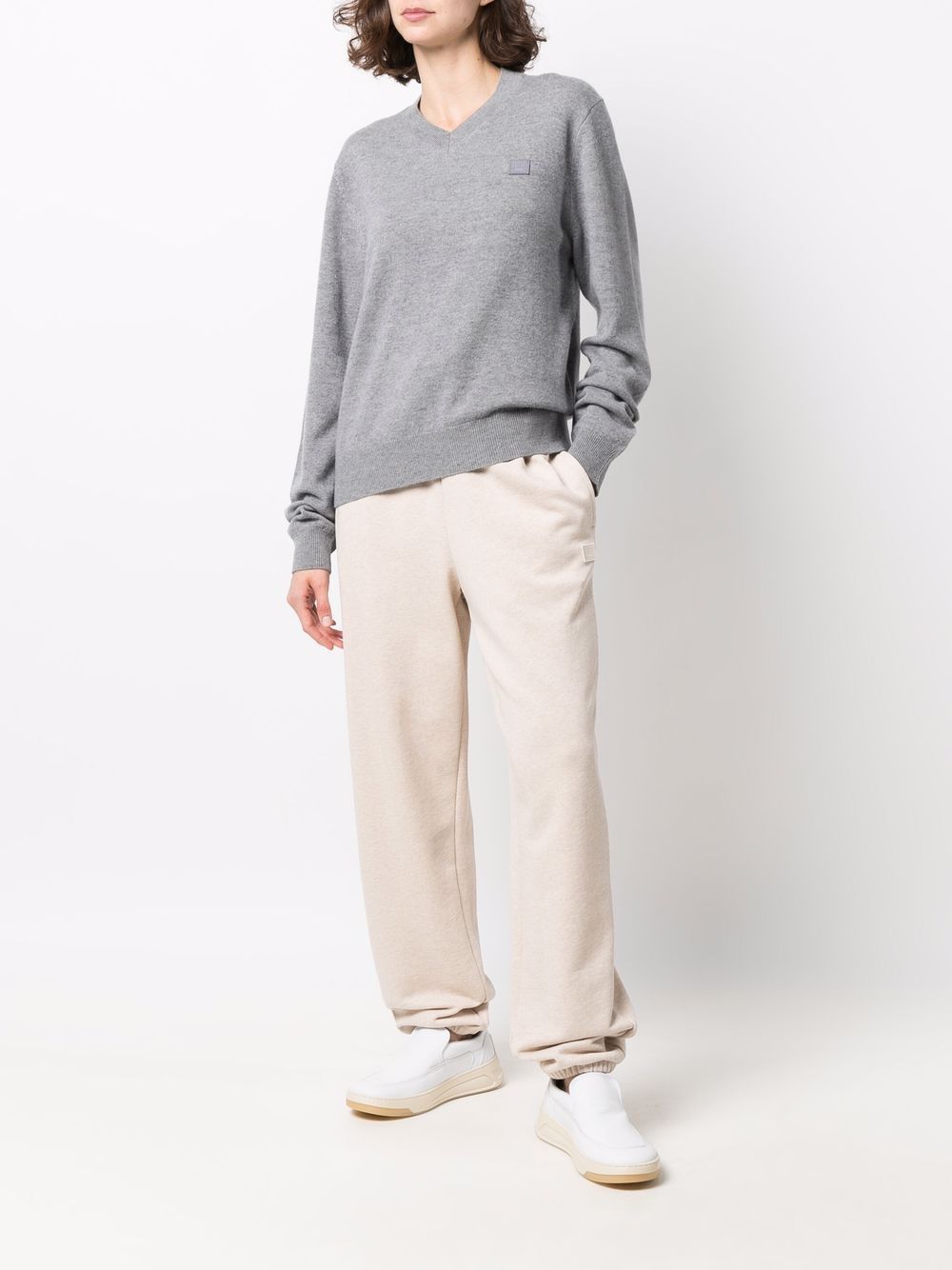 Elevate your sweater game with FACE SWEATER. This grey v-neck features the iconic acne face logo, giving you an effortlessly cool and trendy look. Plus, the cozy black color is perfect for any weather.