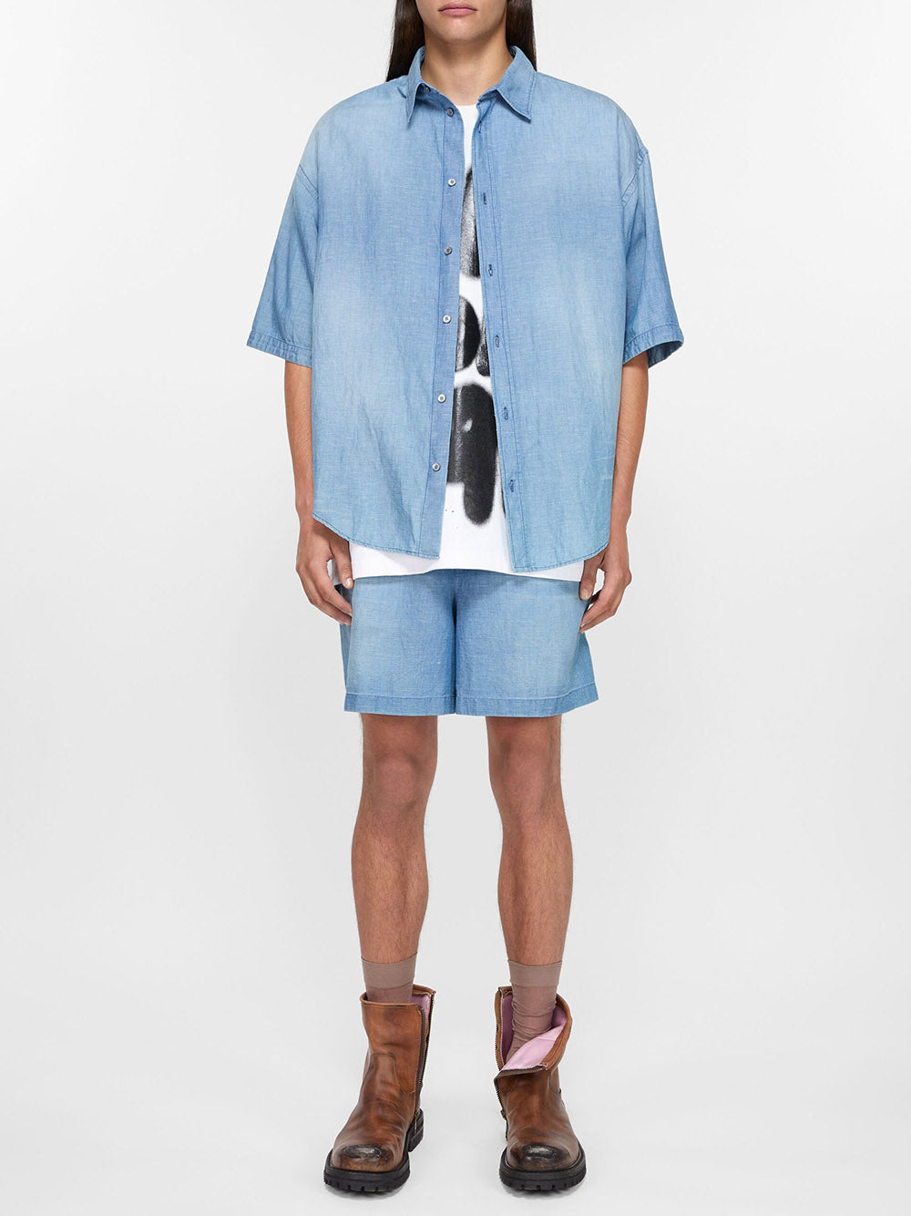 Stay cool and stylish this summer with our Faded Woven Shorts. Made from a breathable cotton and linen blend, these light blue shorts feature a relaxed fit, mid-waist, and wide leg for a comfortable and casual look. Complete with an Acne Studios logo stamp and convenient side seam pockets.