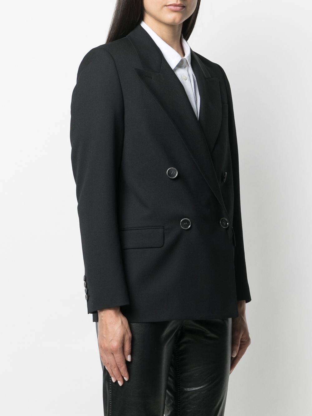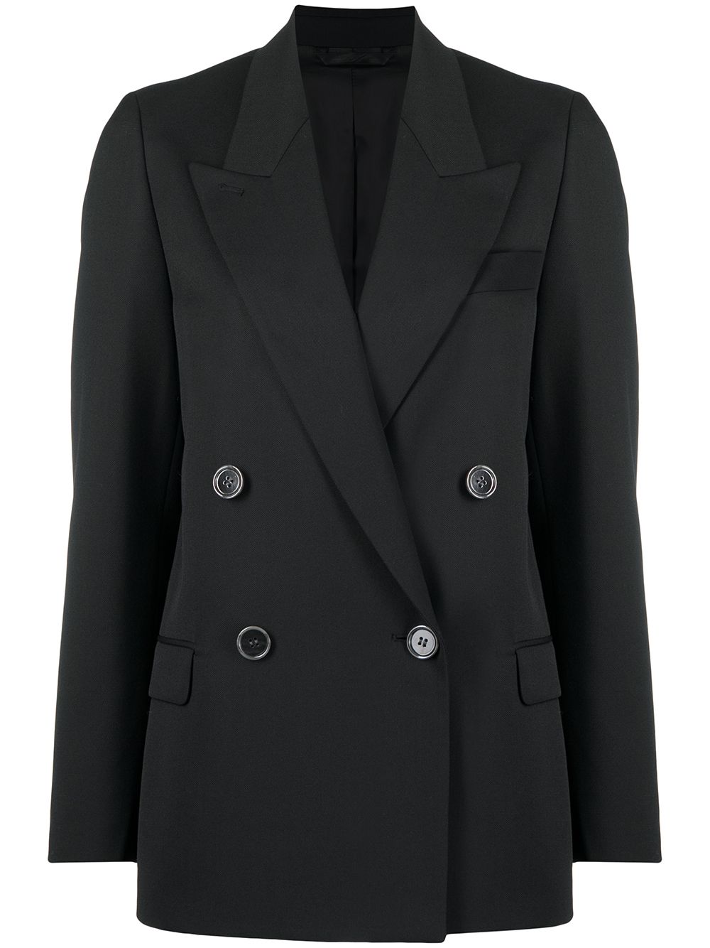 Introducing the Janny Light Jacket from Acne Studios. This black wool-blend suit jacket boasts a chic double-breasted design and stylish wide notch lapels. Complete with two front flap pockets, this jacket is both functional and fashionable. Upgrade your wardrobe with this versatile piece.