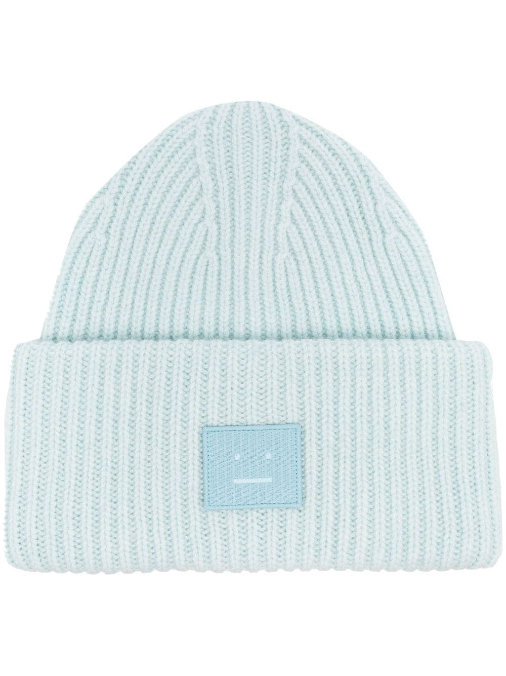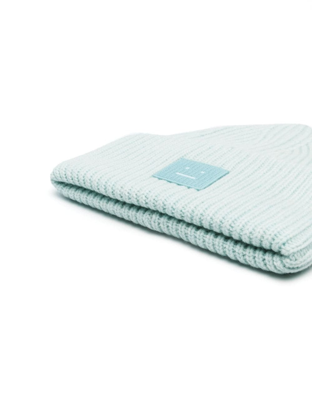 Stay warm and stylish with the Acne Studios Large Face Logo Beanie. Crafted from chunky ribbed wool, this light blue knit beanie features a large embroidered face logo patch. The upturned edge adds a touch of playfulness to this cozy winter accessory.