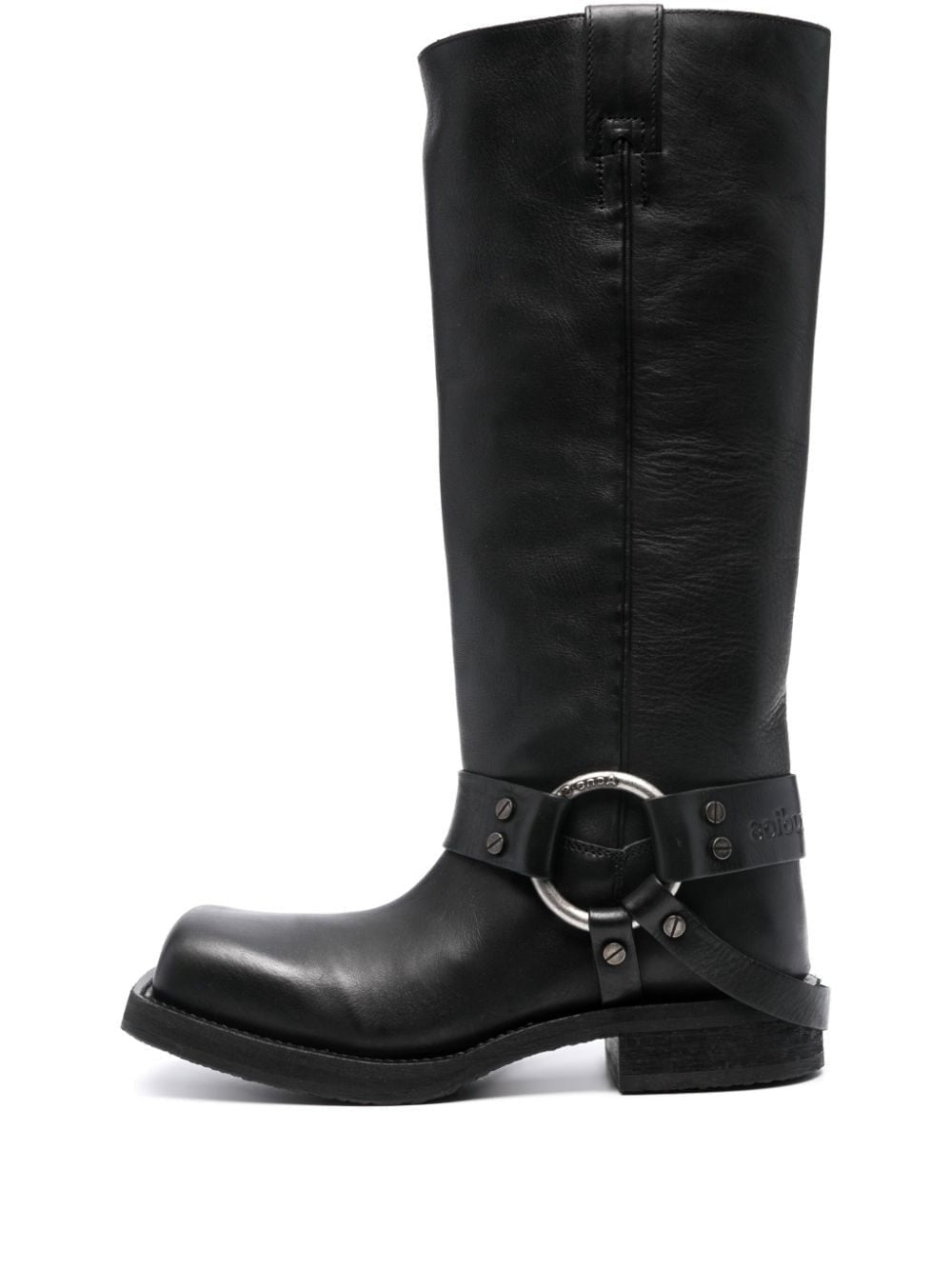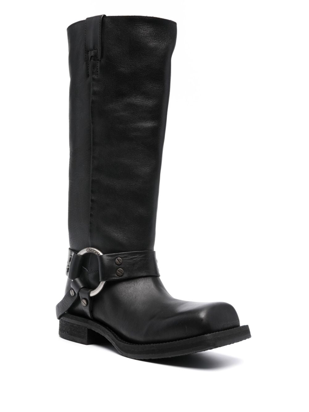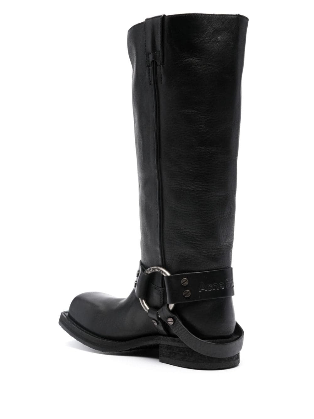 Add some edge to your step with these black leather biker-style boots featuring metal hardware, a square toe, and the debossed Acne Studios logo. With a comfortable heel height of 35 mm and a sole height of 20 mm, these boots are the perfect balance of style and practicality. Made in Italy for the ultimate quality.