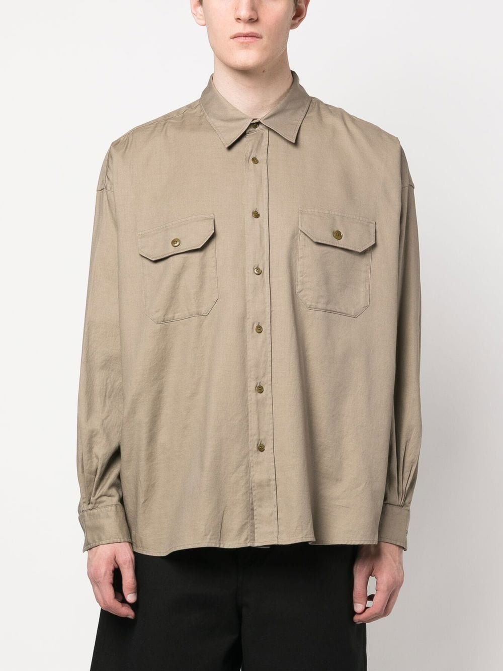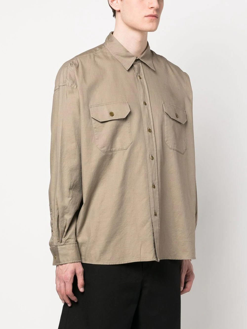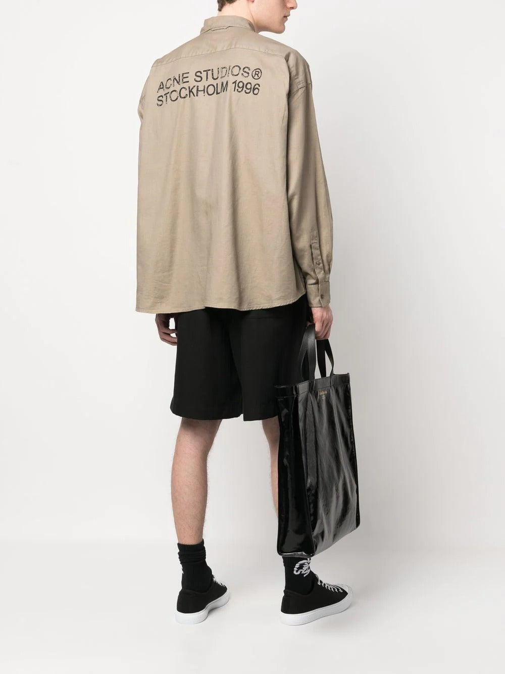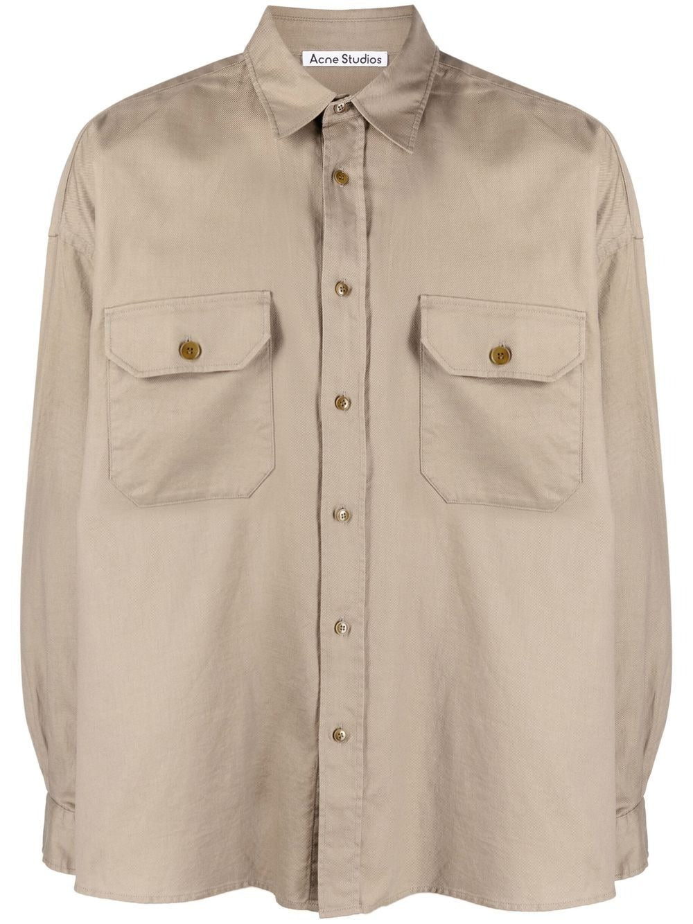 Stay stylish with this beige Acne Studios shirt featuring a logo on the back and front pockets. Perfect for any occasion, this button-up shirt adds a touch of quirky fun to your wardrobe. Make a statement with this unique, printed shirt that combines fashion and comfort.