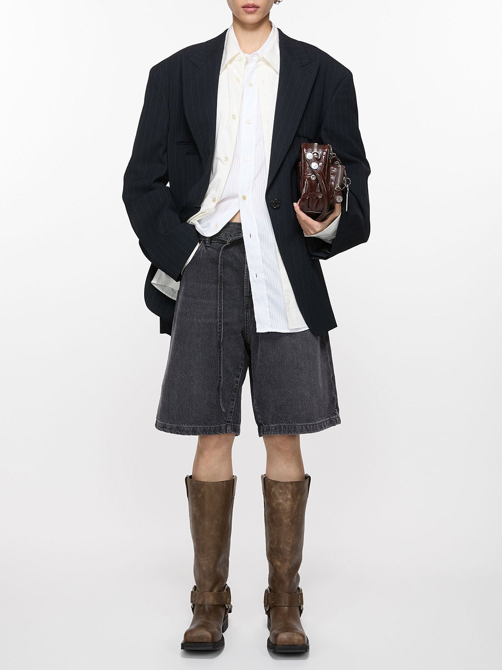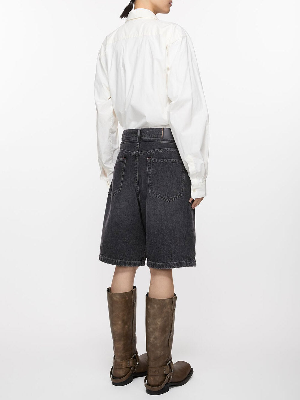 These unique denim shorts come in a versatile black wash with vintage finish, perfect for any casual outfit. The loose, unisex fit offers comfort and style, while the low to mid-waist and knee length add a trendy touch. Complete the look with the matching thin belt and enjoy the 5-pocket construction and button fly.