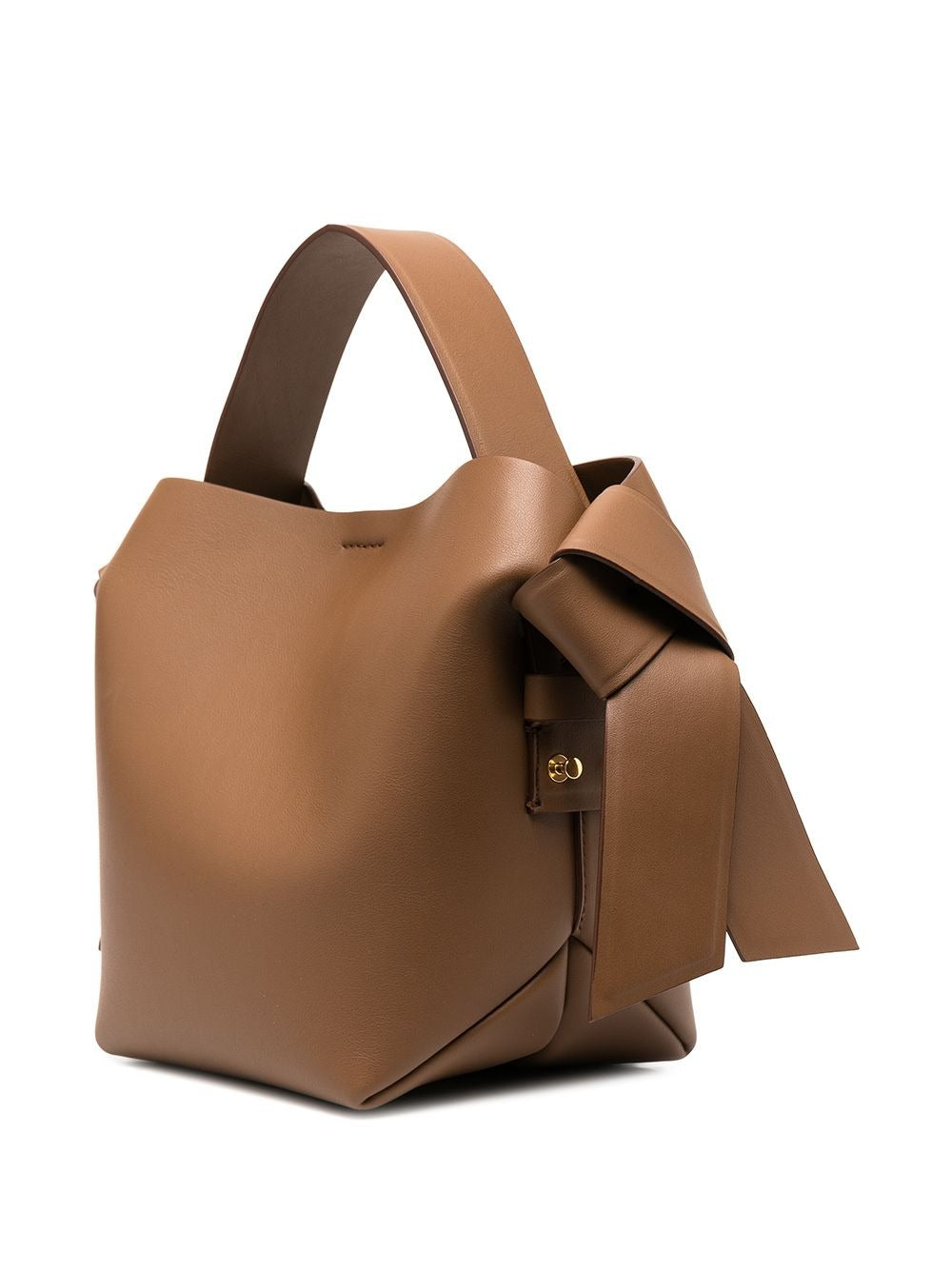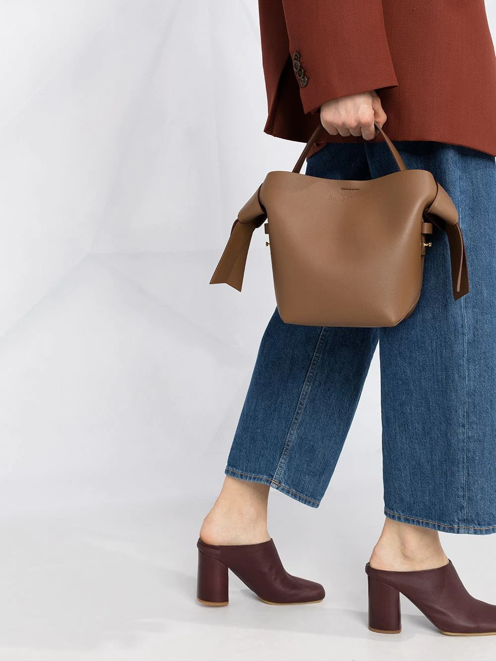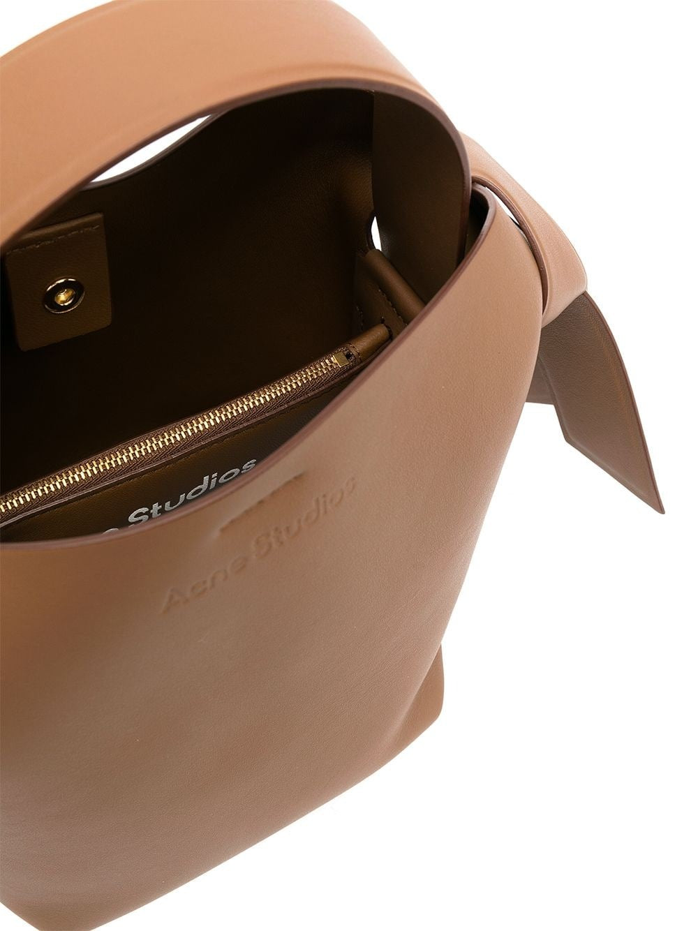 Introducing the Musubi mini shoulder bag, a playful twist on traditional Japanese obi sashes! Crafted from soft leather, this bag features twisted musubi knots on each side and a debossed Acne Studios logo. With its interior zipper compartment and shoulder strap, this camel brown bag is both stylish and functional. (21.5 cm x 20.5 cm x 15.5 cm).