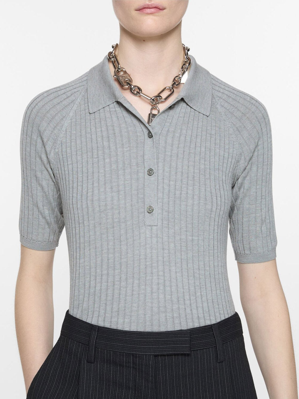 Introducing our light grey POLO KNIT - perfect for a casual day out. With a classic polo collar, front button placket, and fine ribbed detailing, this knit is both comfortable and stylish. Complete your look with the ribbed hem for a polished finish.