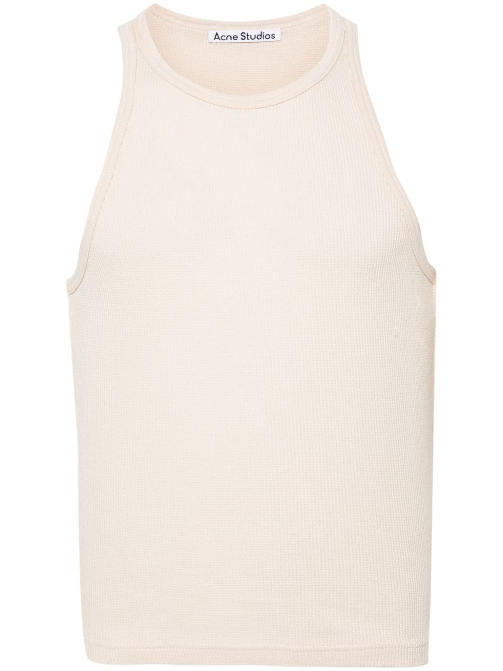 Unleash your style with our cream Tank top. Soft and breathable waffle fabric keeps you cool, while the fitted unisex fit and below waist length flatter your figure. Adorned with an Acne Studios logo patch on the centre back for a touch of playful elegance.