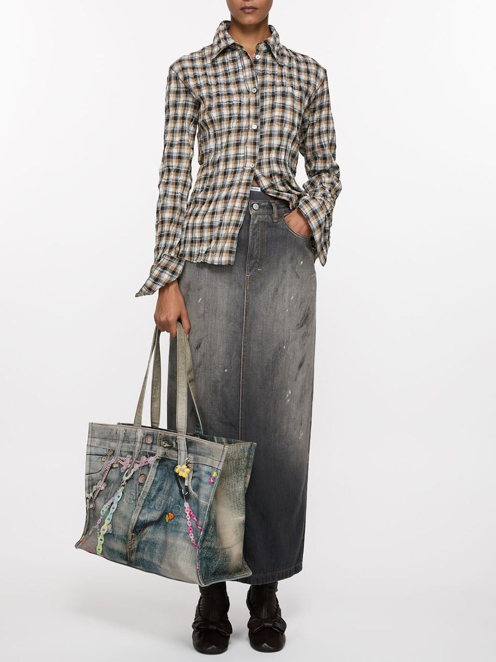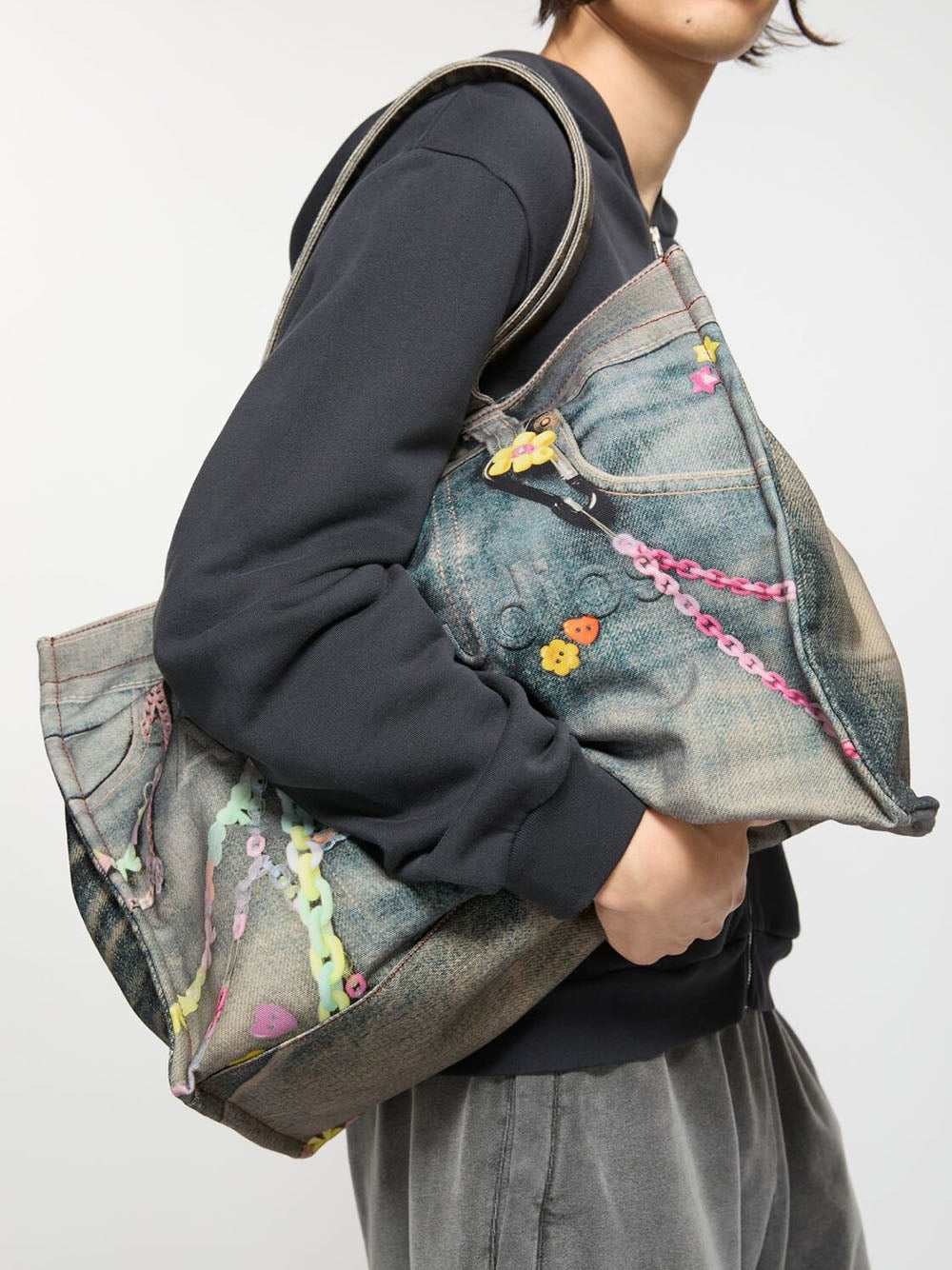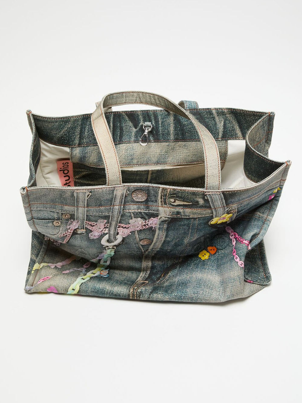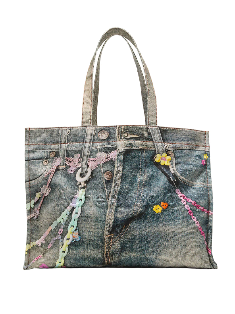 Introducing the TOTE BAG: boasting a playful trompe l'oeil denim print and bold Acne Studios logo. Ideal for daily use, this cotton tote includes a handy internal zip compartment and comfortable shoulder straps. Showcase your whimsical personality with this must-have accessory.