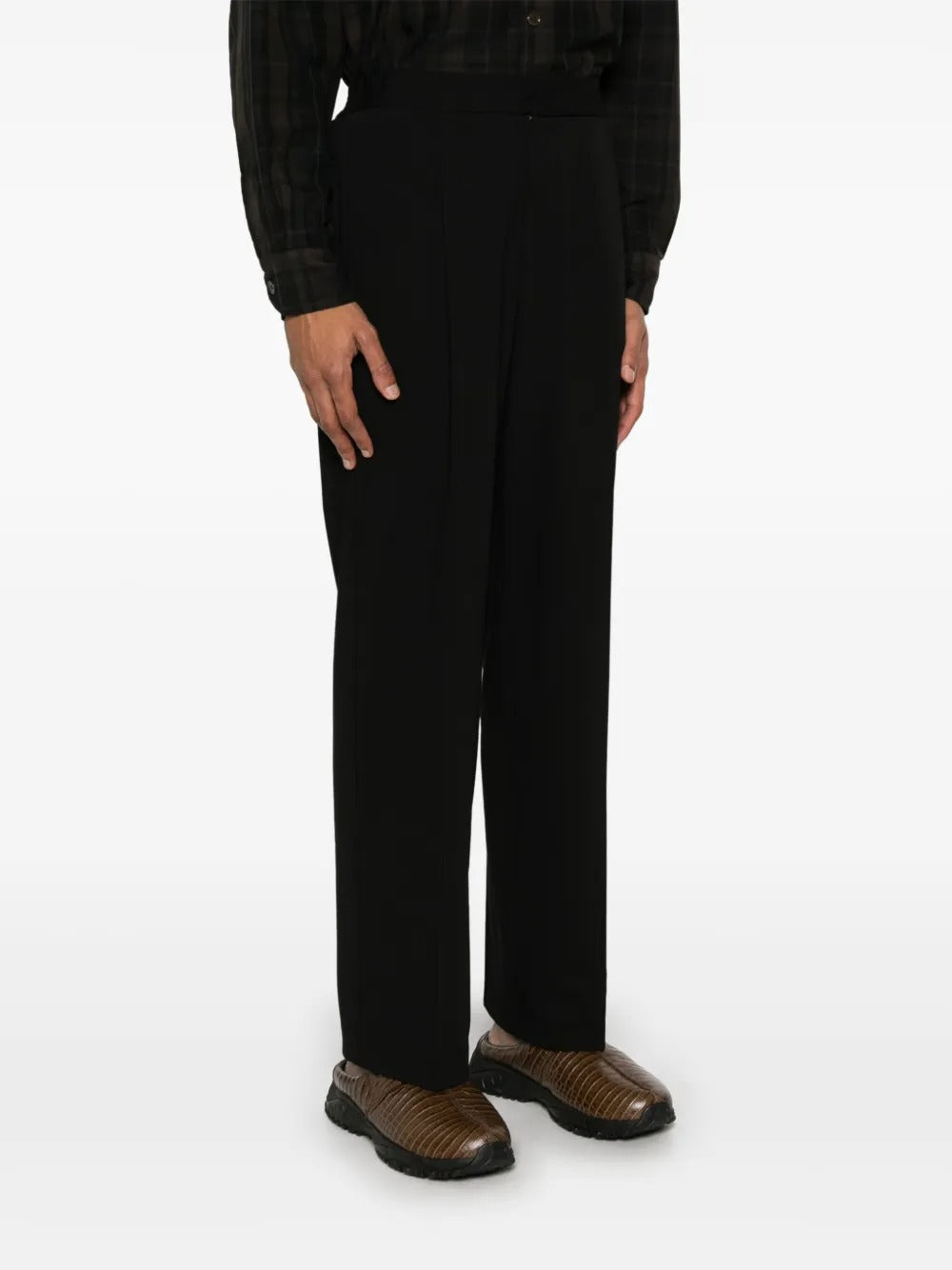Introducing the loose trousers. These black beauties not only have a concealed front button, hook and zip fastening for a sleek look, but they also feature two side inset pockets and two rear jetted pockets for convenience. The pleat detailing adds a touch of sophistication while keeping you comfortable and stylish.