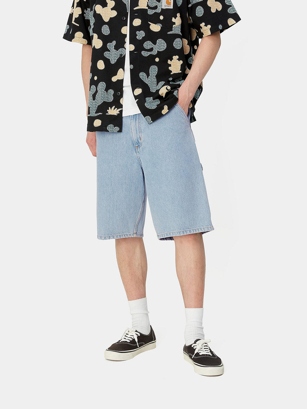 Introducing our Single Knee Short Smith Denim by CARHARTT WIP! These Bermuda shorts feature a zip and button front closure, classic five-pocket design, and belt loops for added convenience. Available in light blue denim.