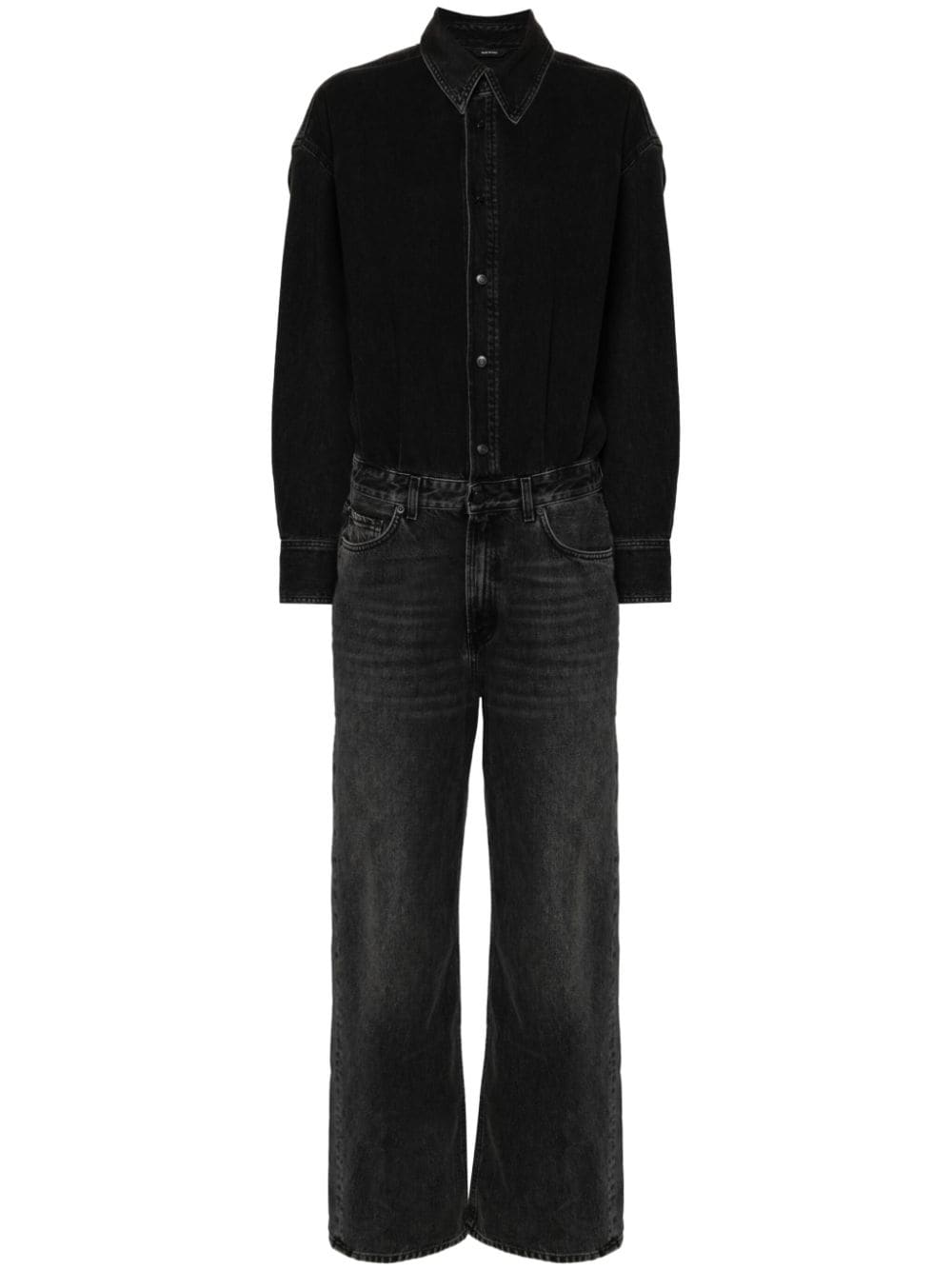 Effortlessly stylish TESSIE MEDIUM BLACK, made from soft cotton. Features a front button fastening, classic collar, and long sleeves with buttoned cuffs. The bottom boasts a front button and zip fastening, classic five pockets, and belt loops. Perfect for any occasion, this versatile piece is a must-have. This denim jumpsuit has a relaxed fit and runs slightly large.