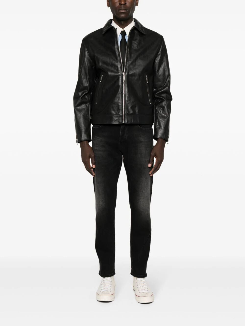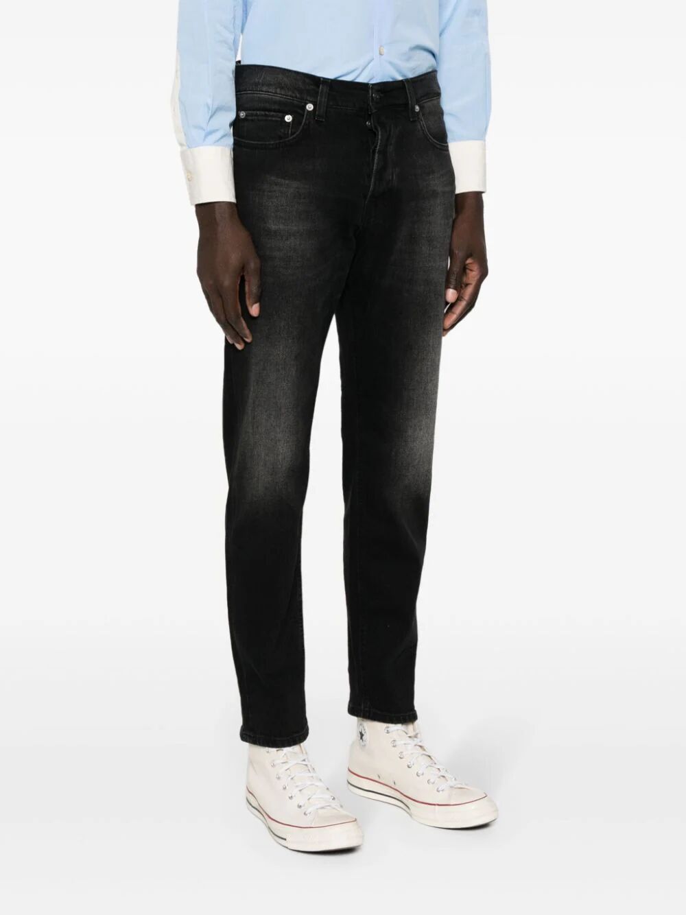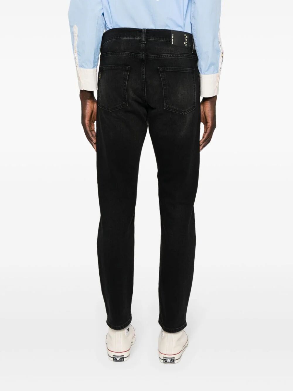 Upgrade your denim game with Tokyo Slim Black Denim. This stretch-cotton washed denim features a slim cut for a flattering fit. The whiskering effect adds a touch of edginess, while the belt loops and classic five pockets provide practicality. Finished with a logo patch and button fly fastening.