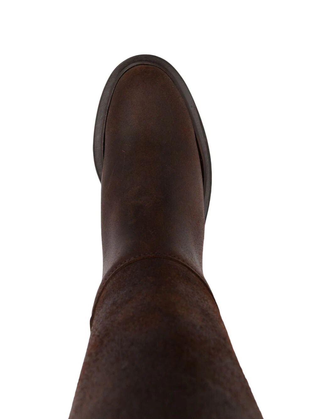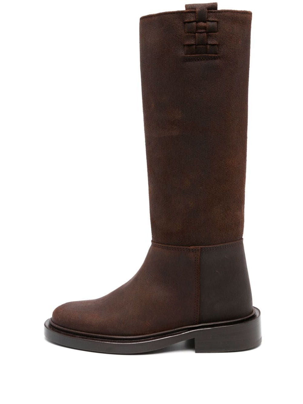 Step into style with Anella Waxed. This unique boot features a charming cedar brown suede design with an interwoven pattern. The round toe and pull-on style make for easy wear, while the branded leather insole offers comfort and the 45mm mid block heel adds a touch of height. The waxed leather features natural variations and subtle markings that highlight its authenticity and craftsmanship. These are not imperfections, but unique characteristics of the material.