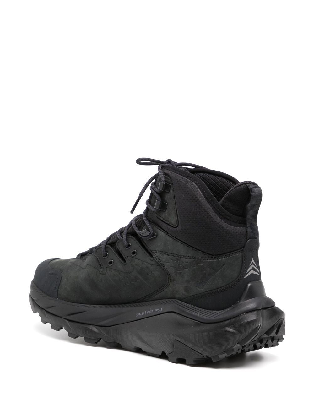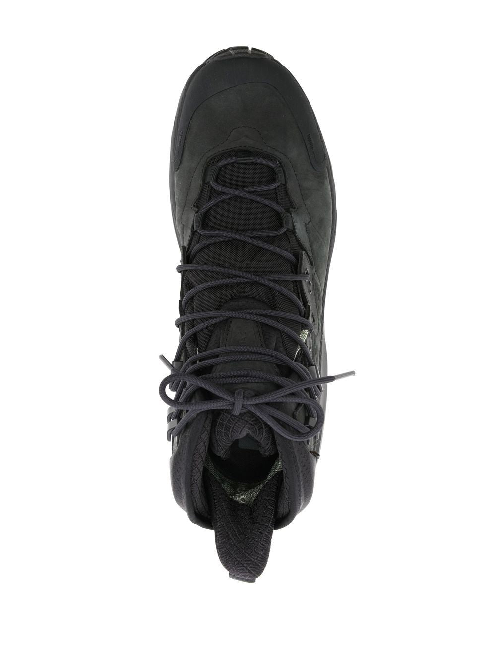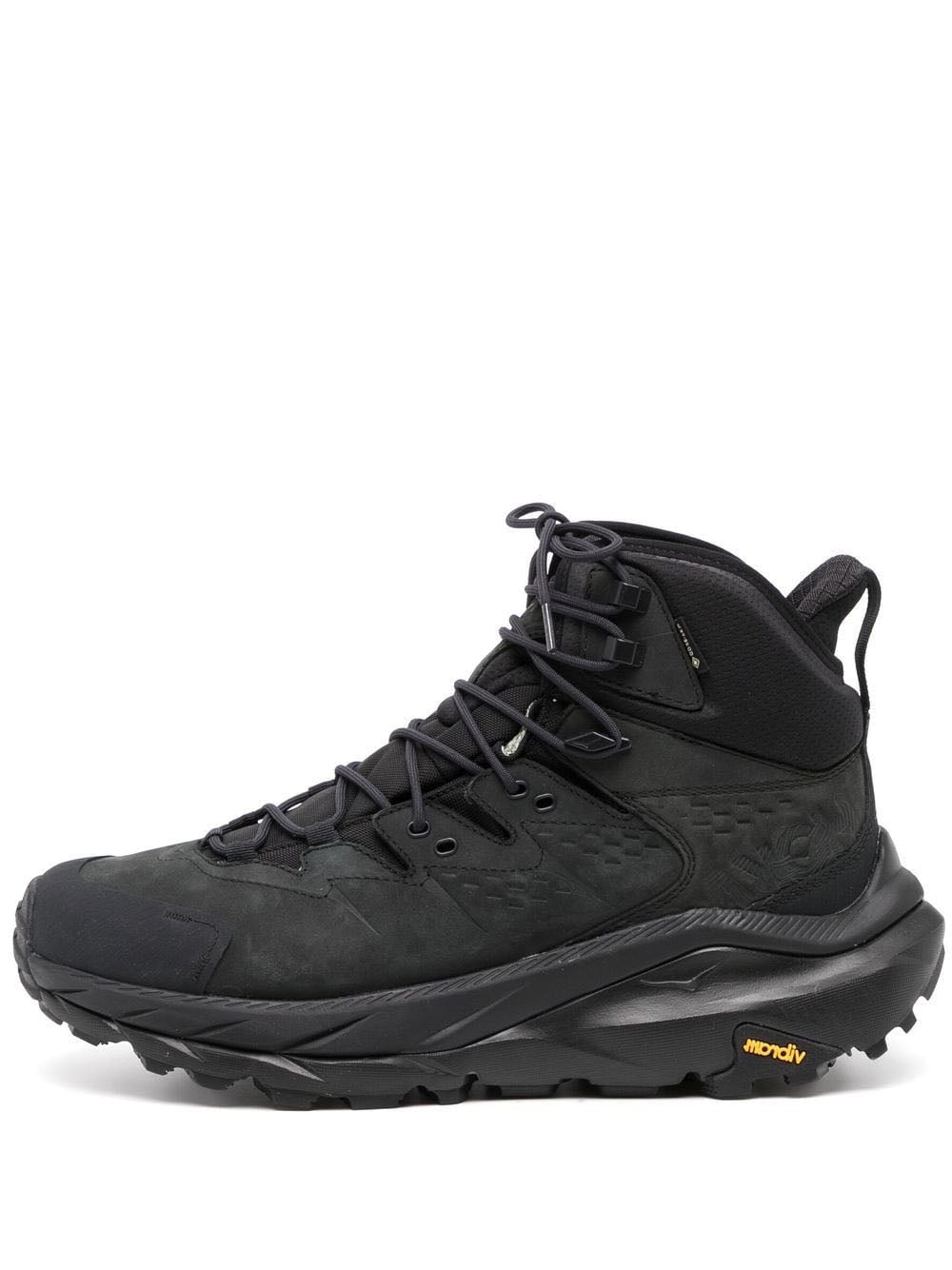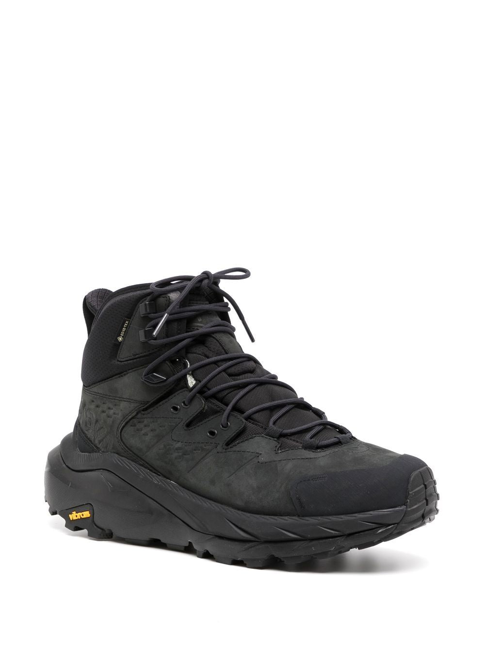 Step up your shoe game with the M KAHA 2 GTX. Made with black calf suede and featuring a debossed logo, these ankle-length boots are perfect for any occasion. With a pull-tab at the heel and a round toe for comfort, they also have a chunky rubber sole for durability. Don't miss out on the stylish front lace-up fastening and branded insole. Walk with confidence and style in these unique boots.