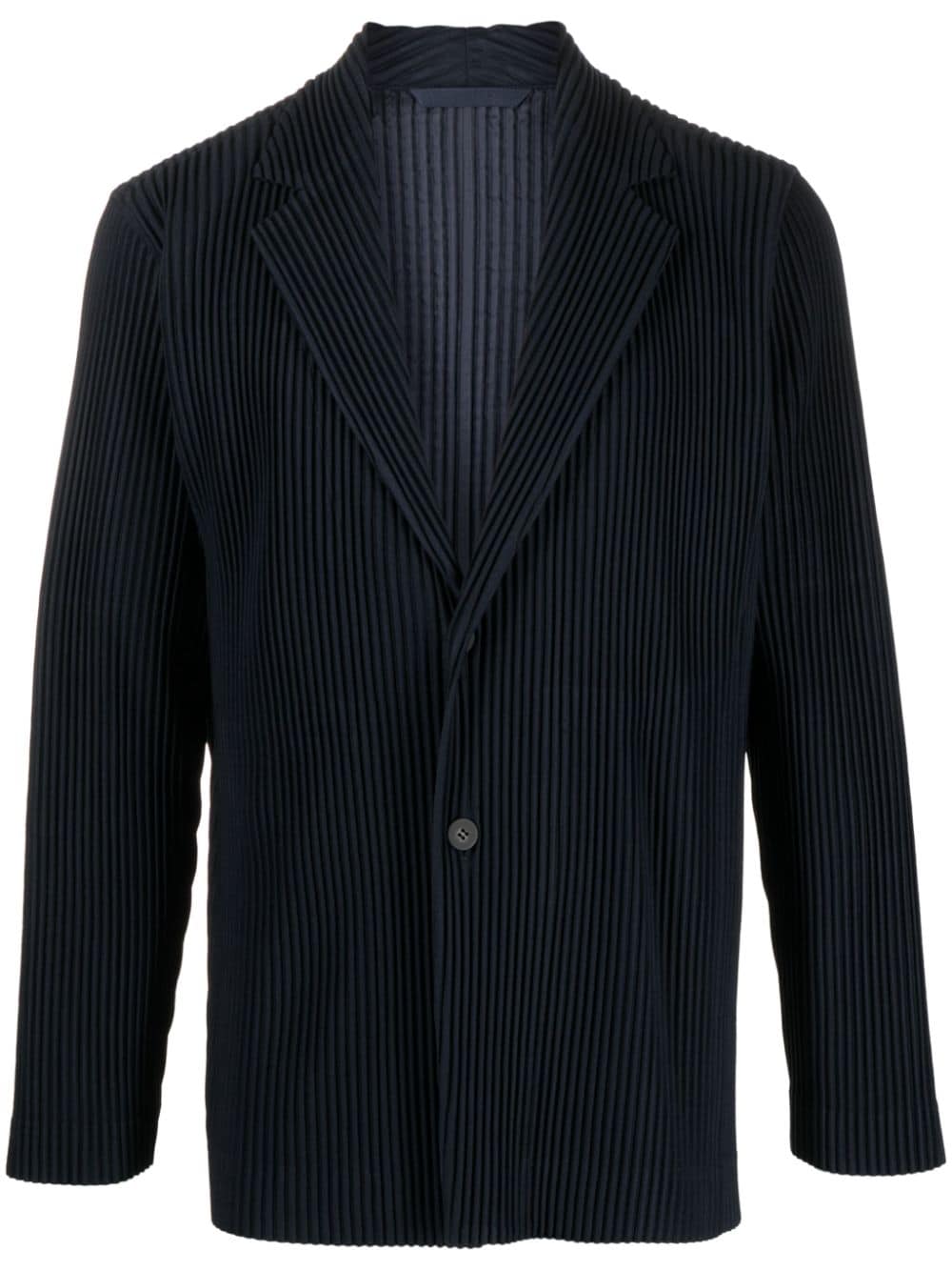 Upgrade your blazer game with our notched-lapels pleated blazer, made from sustainable navy blue recycled polyester. The fully pleated design and front button fastening add a touch of sophistication. With long sleeves and a straight hem, you'll be ready for any occasion.