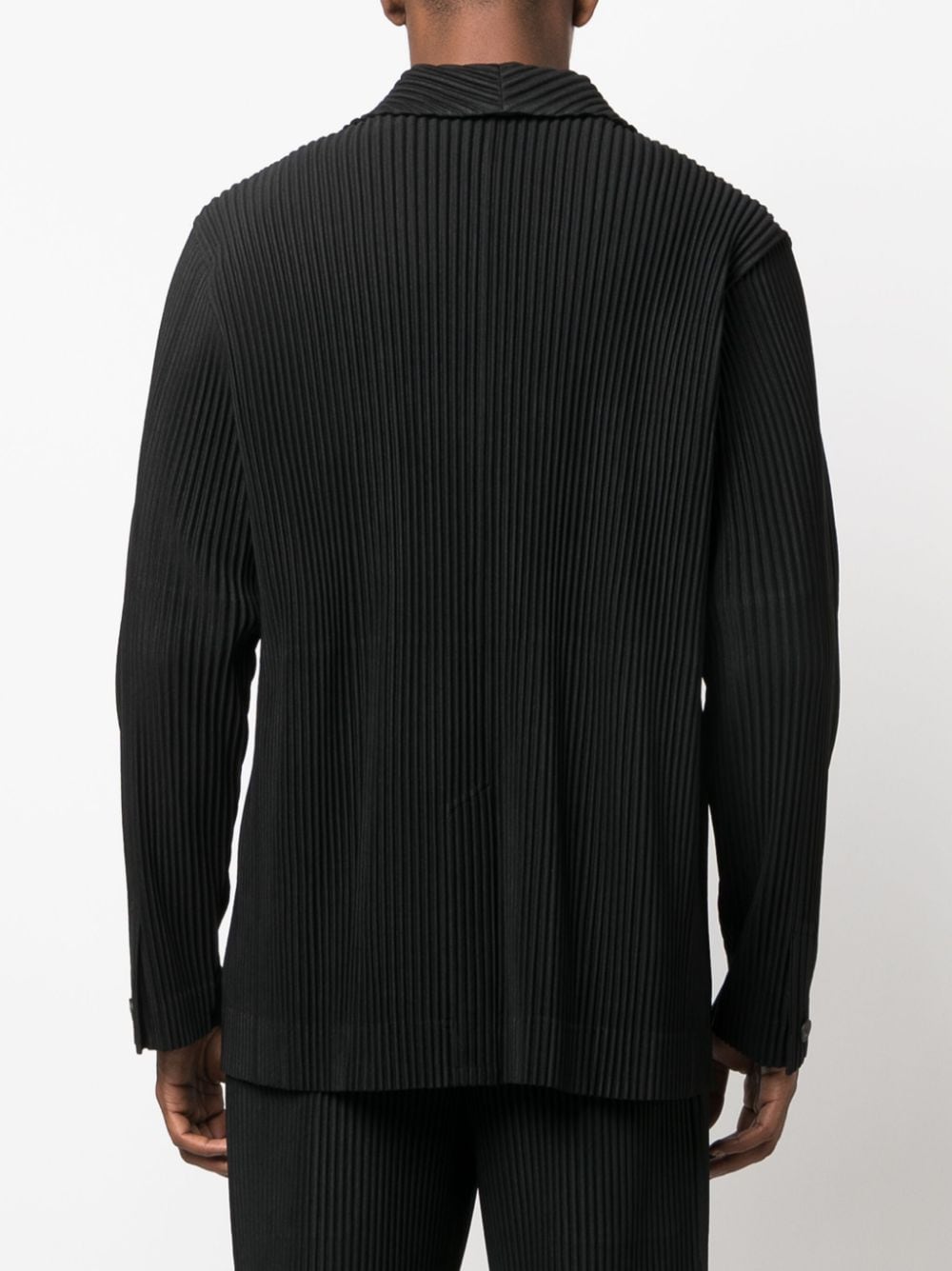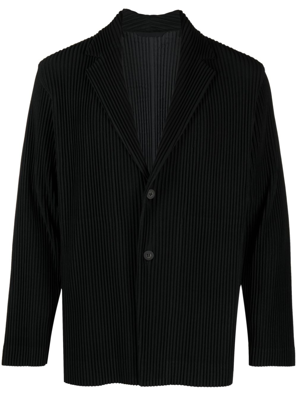 Upgrade your wardrobe with the Issey Miyake Homme Plisse Tailored Pleated Blazer in classic black. This unique blazer features two buttons and convenient side pockets, making it both stylish and functional. Perfect for any occasion.