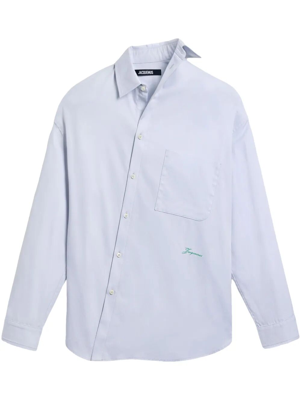 Introducing the Cuadro shirt - a playful addition to your wardrobe. Made in Italy, this light blue shirt features a unique asymmetric design, front button fastening, and a chest patch pocket. Perfect for adding a touch of quirkiness to any outfit.