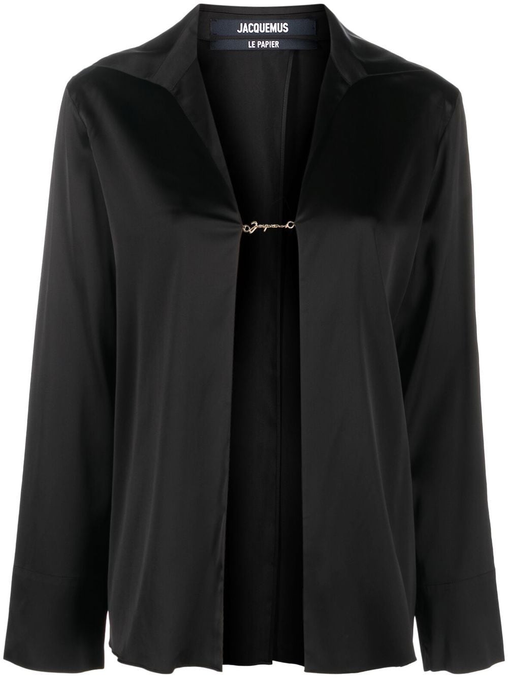 Unleash your chic and playful side with LA CHEMISE NOTTE, the open shirt with a touch of Jacquemus charm. The straight cut and long sleeves are made with luxurious satin stretch, while the pointed collar adds a touch of elegance. And don't forget the metal golden charm by Jacquemus, and the back slit for an extra dose of style. Available in black.