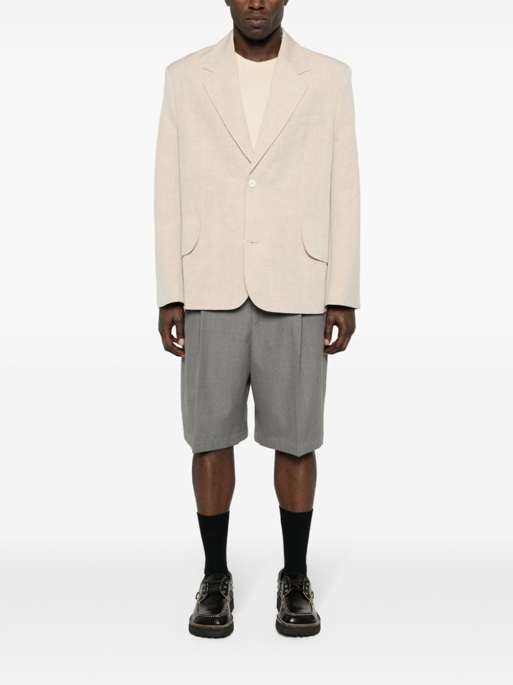 Upgrade your wardrobe with LA VESTE TITOLO, featuring a medium beige color in a blend of linen and virgin wool. This jacket boasts notched lapels, shoulder pads, long sleeves with faux buttoned cuffs, a chest welt pocket, and two front flap pockets. Complete with a central rear vent, internal slip pockets, and partial lining, and a front button fastening for a sleek look.