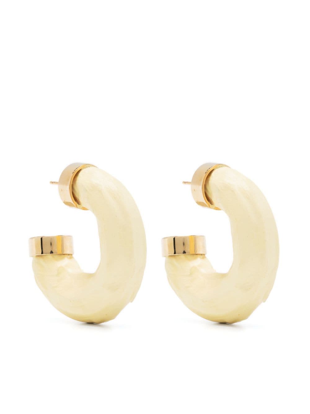 Complete your look with these funky "LES CREOLES BEURRE" hoop earrings from Jacquemus. The cream and gold tones add a touch of whimsy to any outfit. Spice up your wardrobe with these unique earrings.