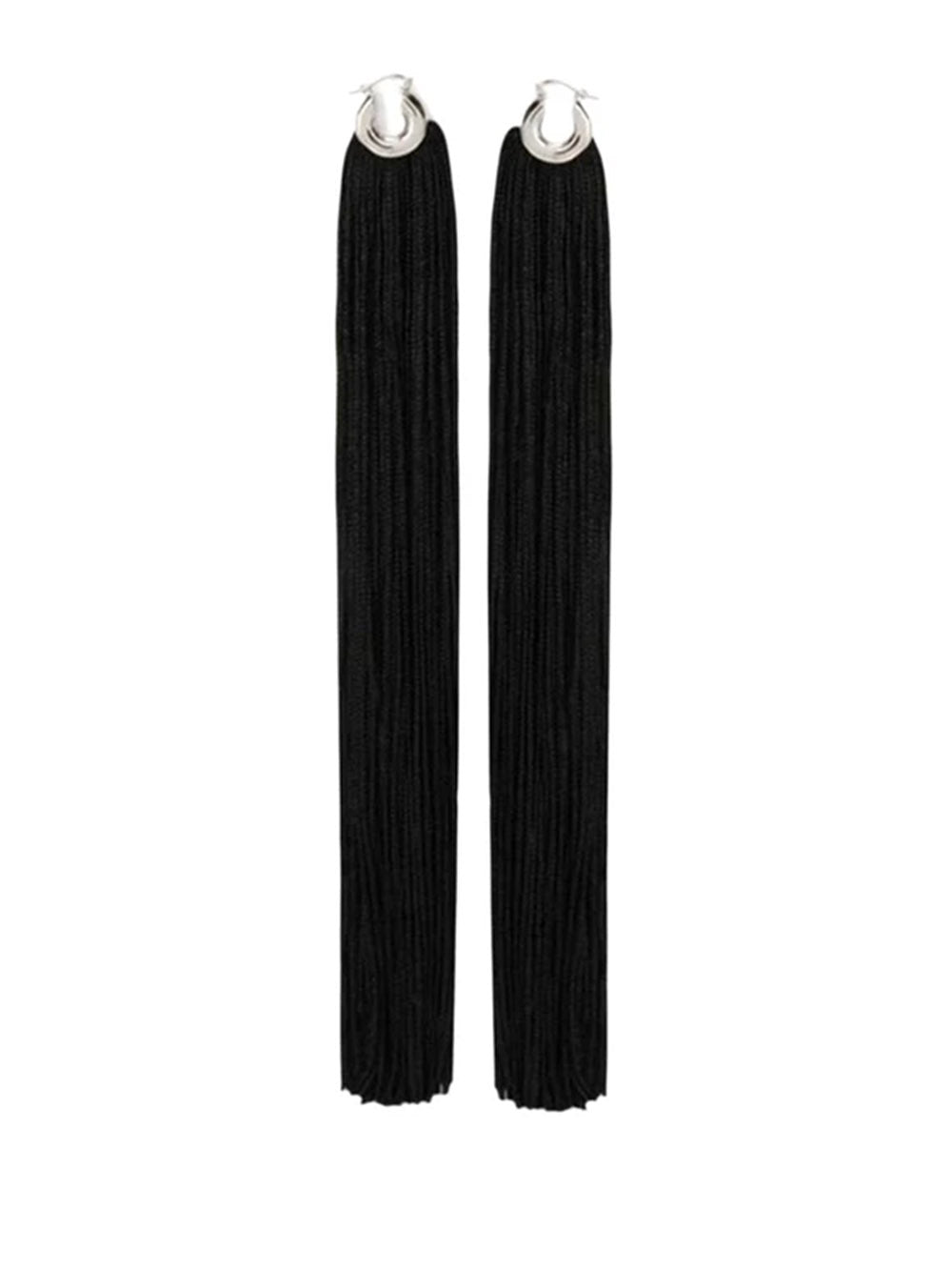 These handcrafted brass hoop earrings with fabric fringes and engraved Jil Sander logo offer a playful twist on traditional design. In silver tones with black fringes, they feature an anti-oxidant treatment and are nickel tested. Snap closure for easy wear.