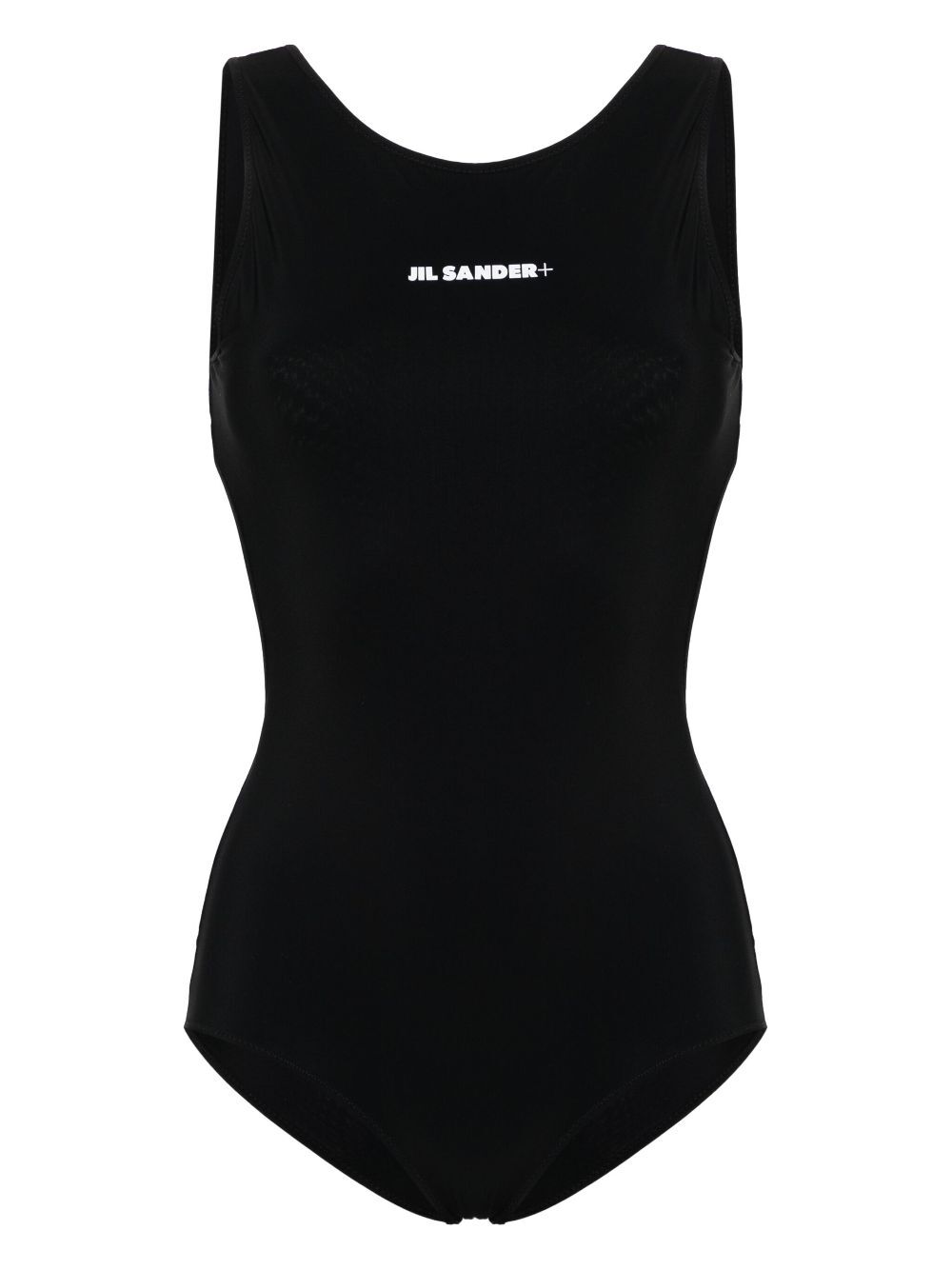 Stay stylish and dry with the black Jil Sander SWIMSUIT 107. This fast-dry jersey swimwear features a round neckline, open back, and the iconic logo printed on the front. Perfect for your next pool party or beach day!