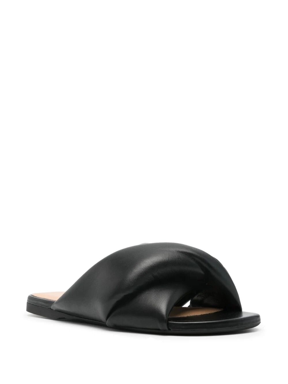 Slip into style with these FLAT TWIST SANDALS. The black calf leather construction and crossover strap detail add a touch of elegance, while the twist detailing and almond open toe keep things playful. The branded leather insole and flat rubber sole ensure all-day comfort in this slip-on style.