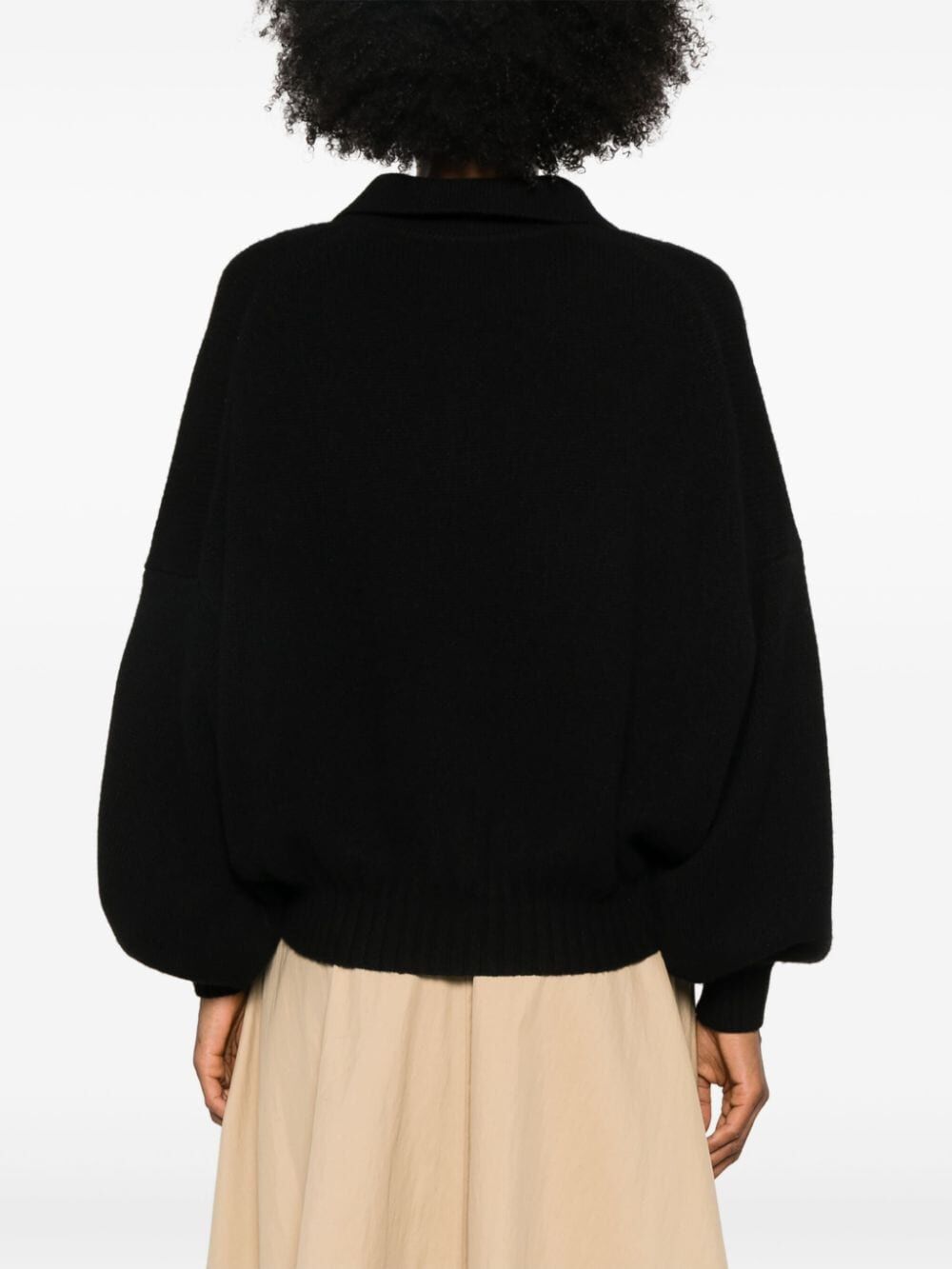 The RENE SWEATER: a cozy black cashmere polo with voluminous sleeves and tortoiseshell buttons. Ribbed trim at the hem and cuffs adds refinement to this luscious piece. Keep warm and stylish all winter long.