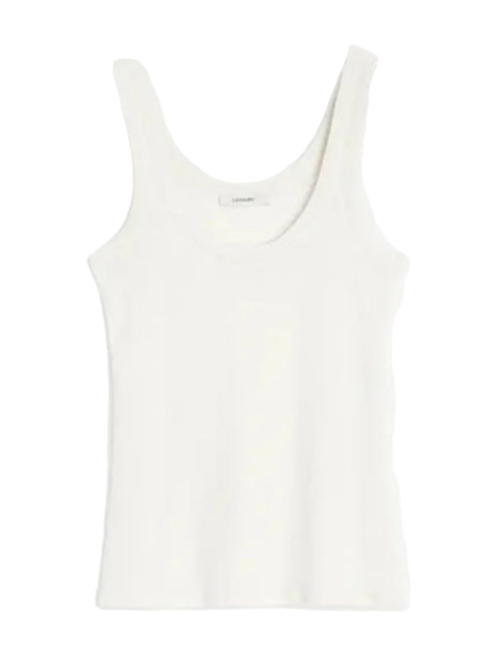Stay cool in our white RIB TANK TOP by Lemaire. The scoop neck and sleeveless design make it perfect for hot summer days.