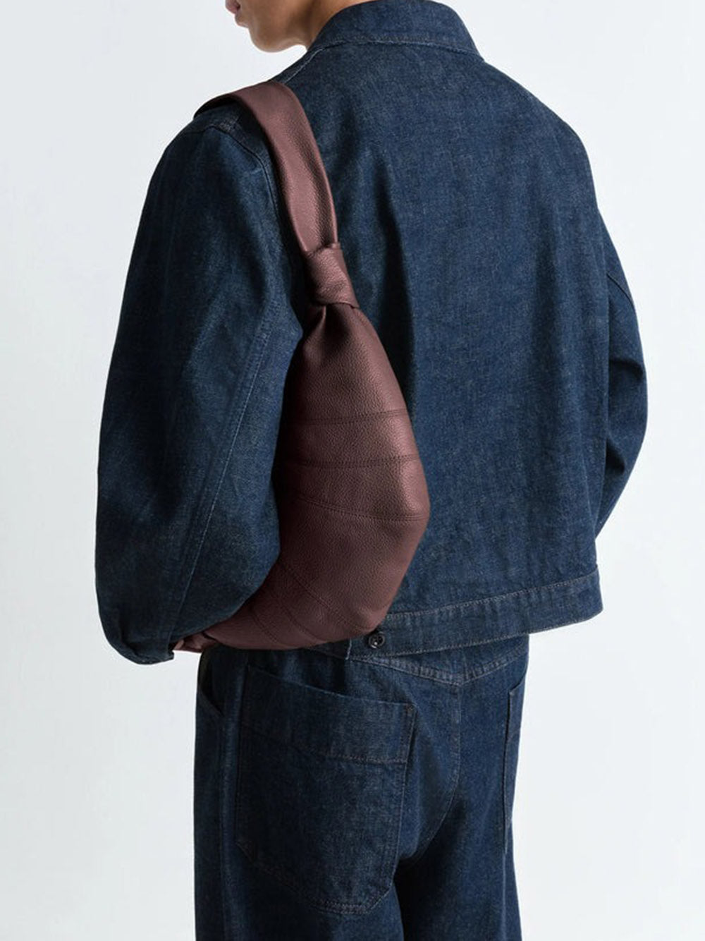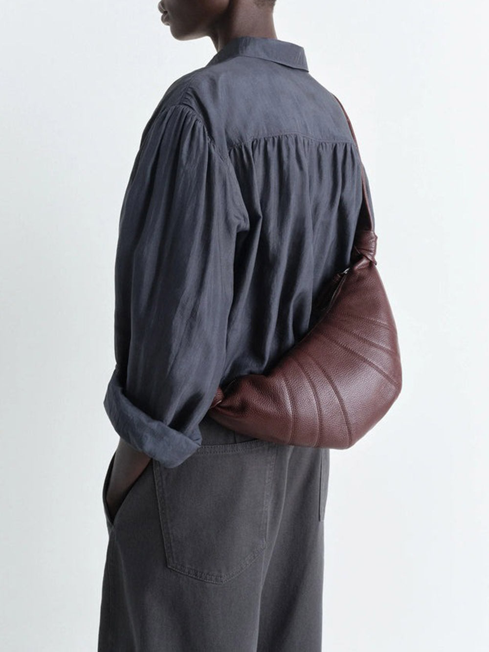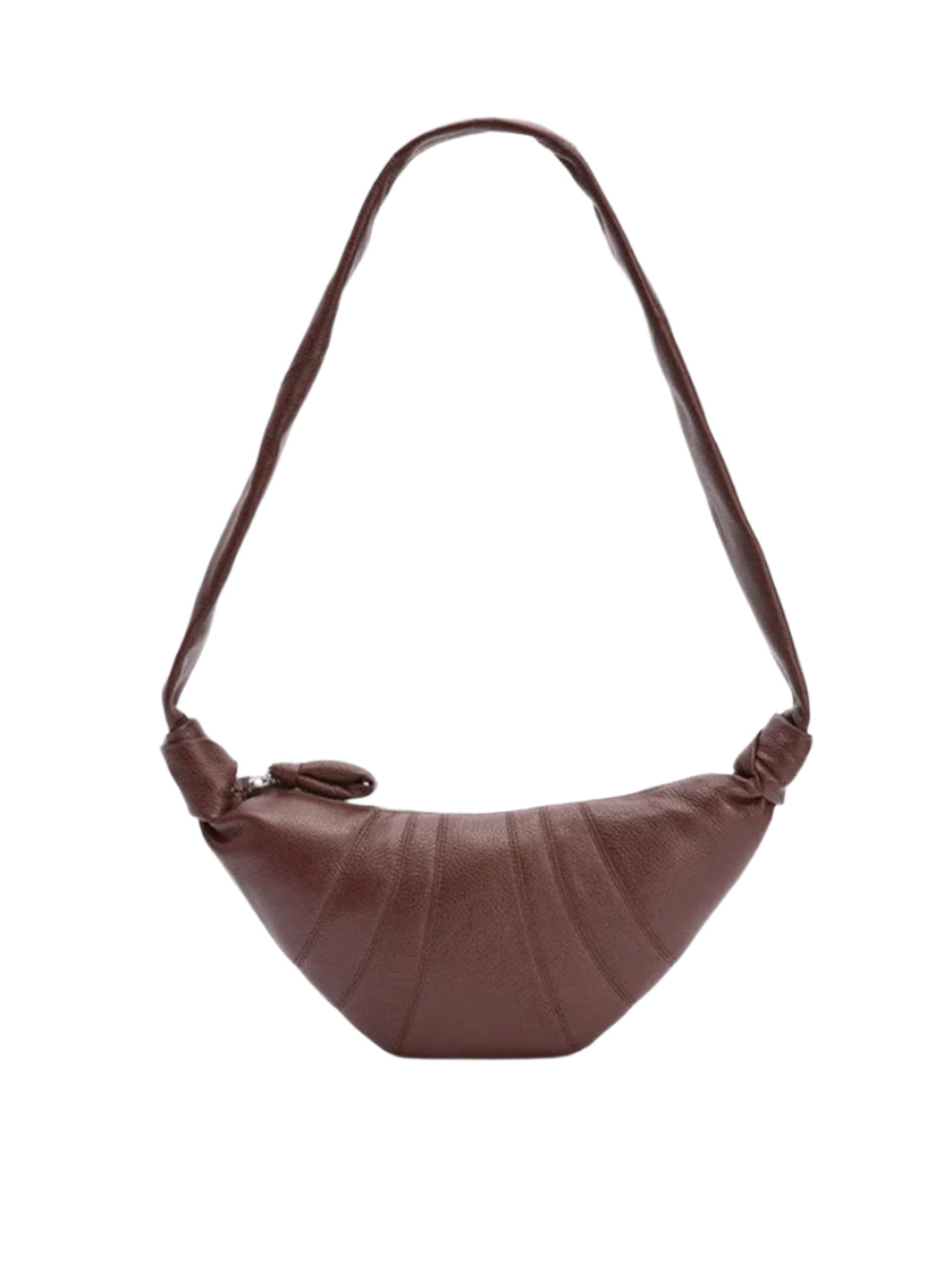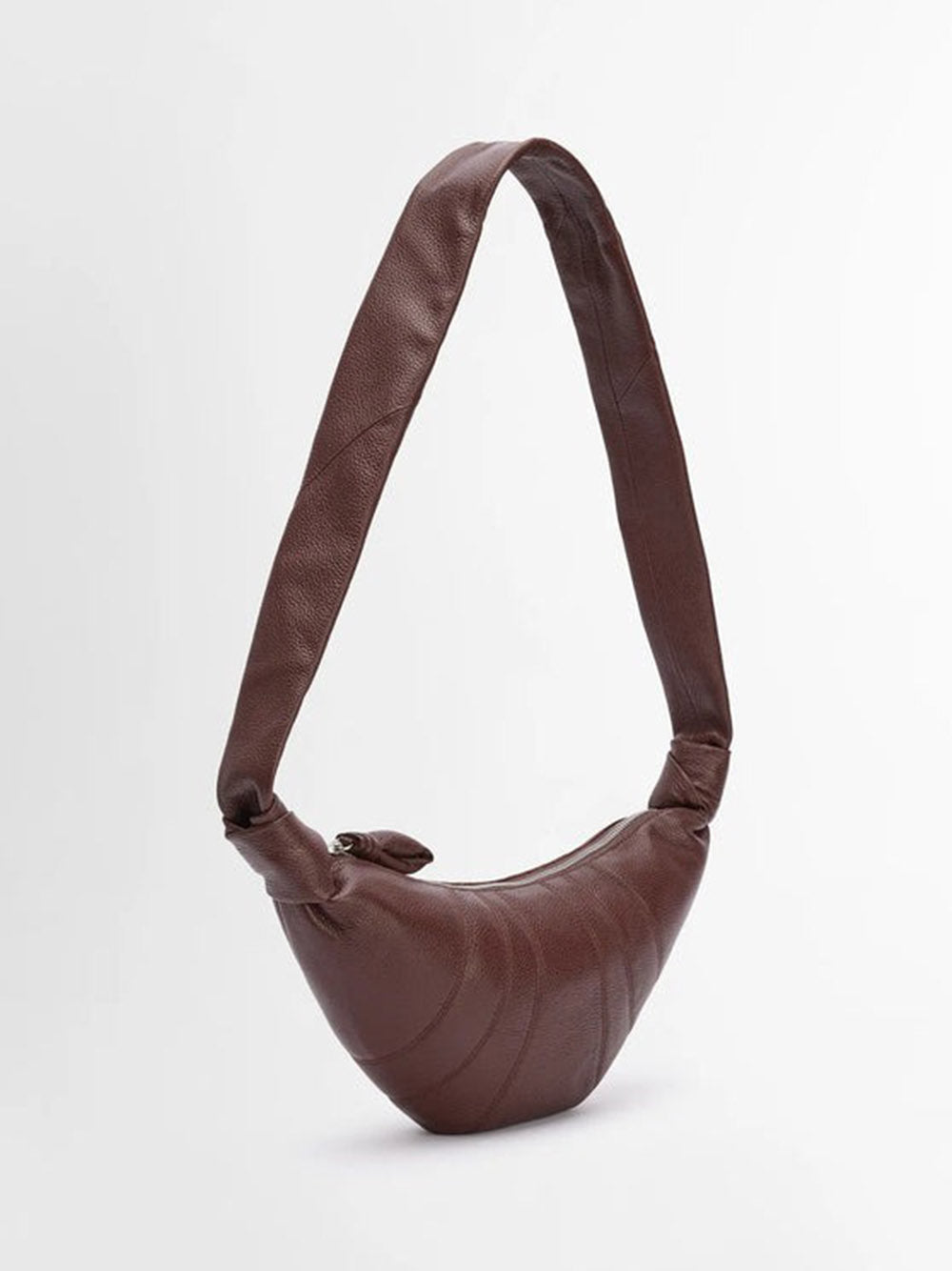 Introducing the SMALL CROISSANT BAG from LEMAIRE's iconic Croissant family. Made of soft grained leather with a tactile surface, this bag is both supple and durable. Its clever design, inspired by the croissant pastry, includes top-stitched cutouts, a stylish looped zip puller, and a side knot finish. It's the perfect size for small essentials and can be worn over the shoulder or cross-body. Available in brown.