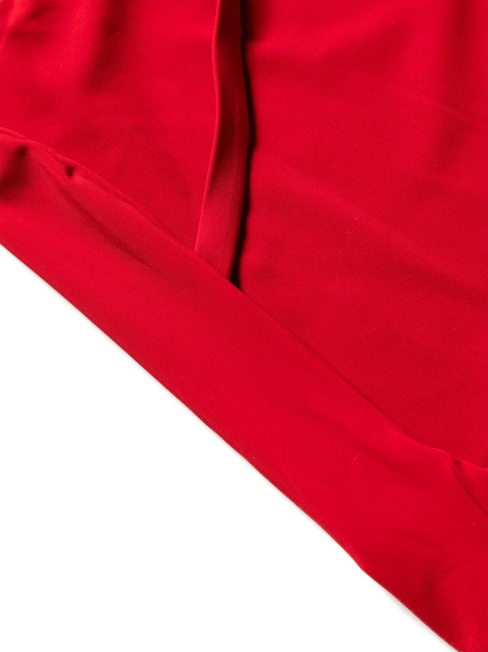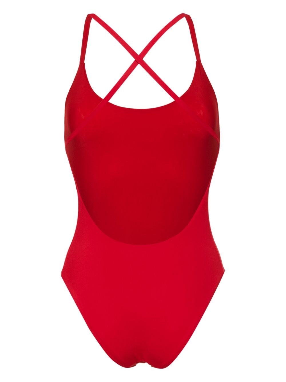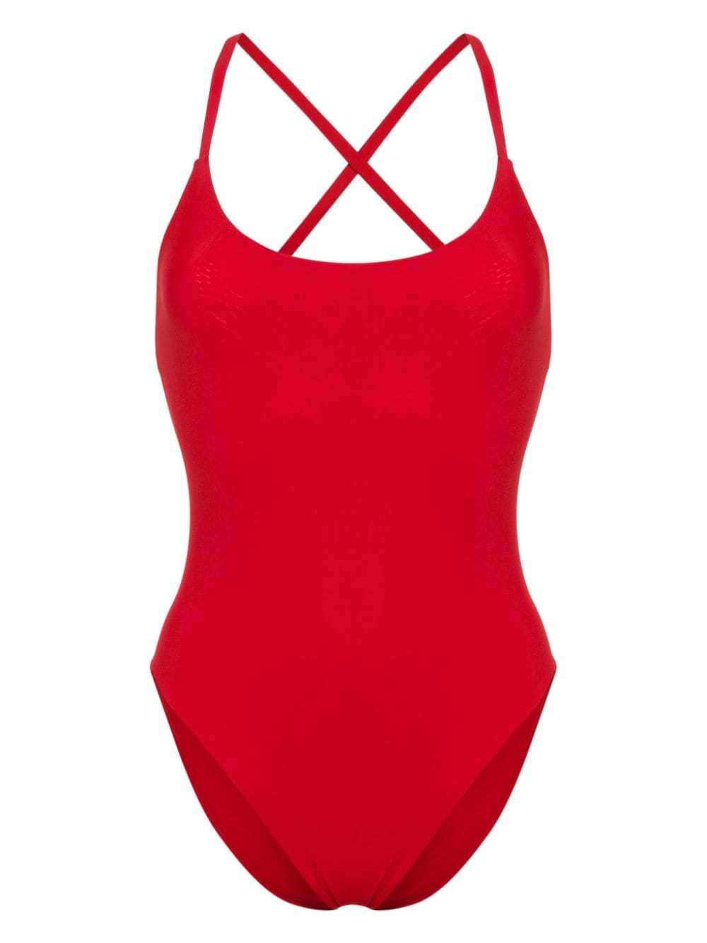This Italian-made swimsuit features a playful criss-cross back design, with stretch straps for comfort and a low scoop neck for a flattering look. Perfect for trying on over your own clothes. Available in red.