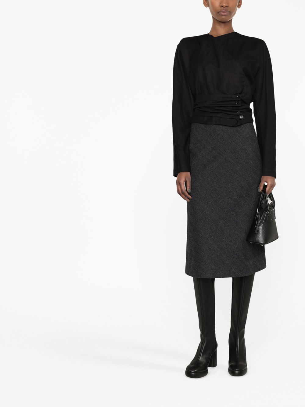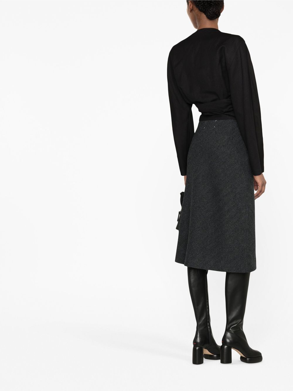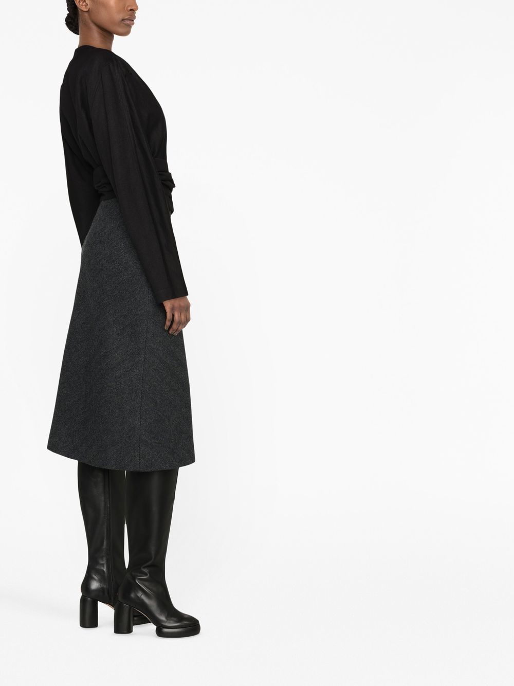 Step up your style game with this A-line skirt in a dark grey herringbone pattern. Made of a luxurious wool-silk blend, this high-waisted skirt flatters your figure and falls to a chic mid-length. Perfect for any occasion, from work to weekend. Made in Italy.