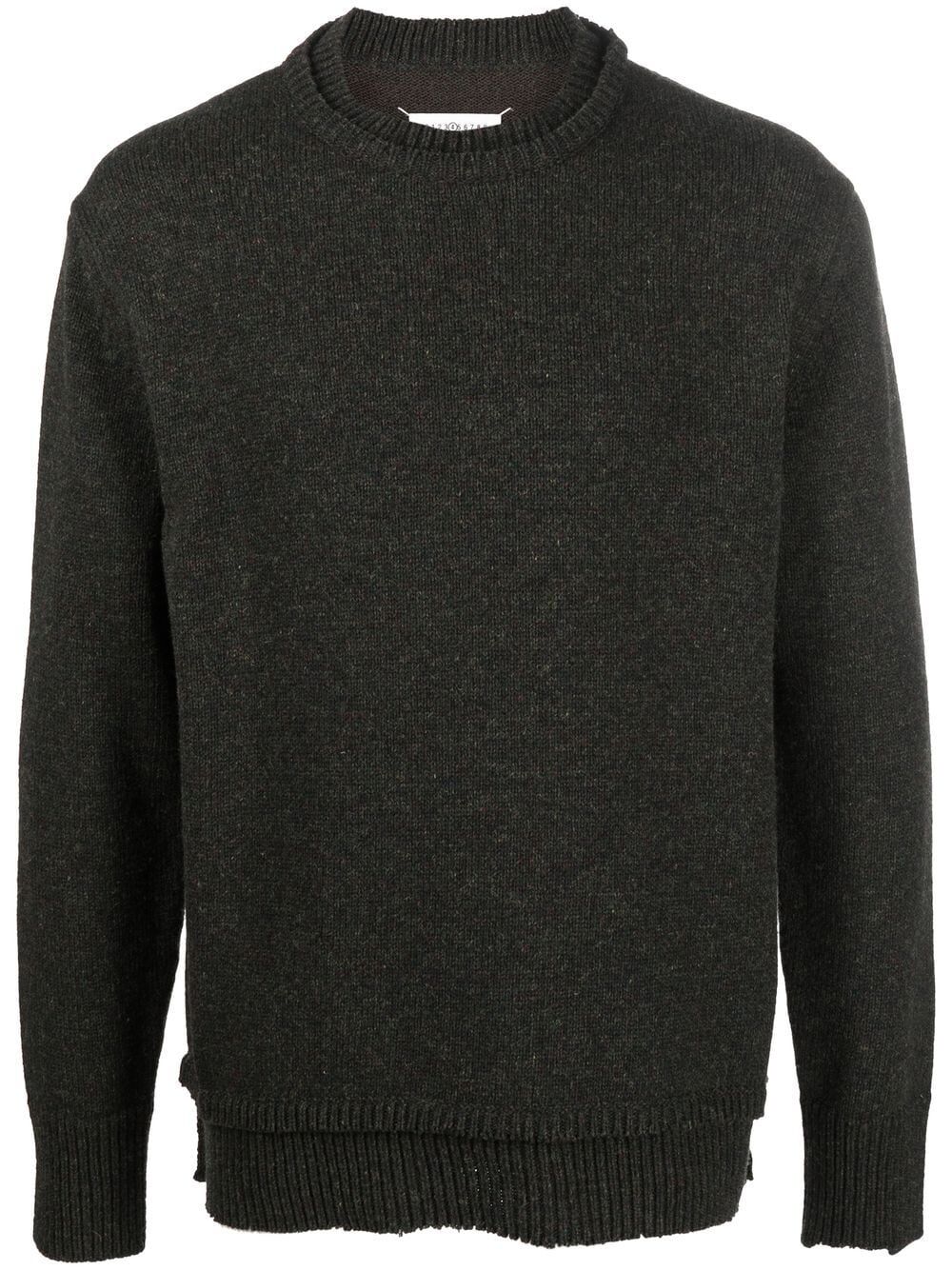 Stay cozy and stylish in our military green jumper, featuring a fine knit design and calf leather elbow patches. The classic crew neck and long sleeves are accented by a ribbed-knit edge for added detail. A perfect blend of comfort and sophistication.