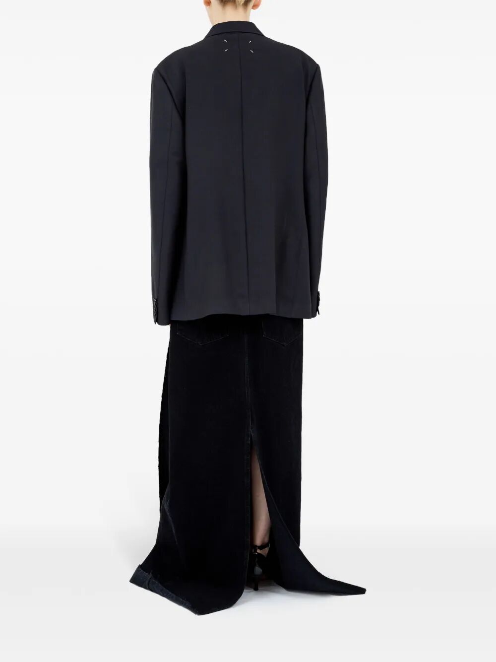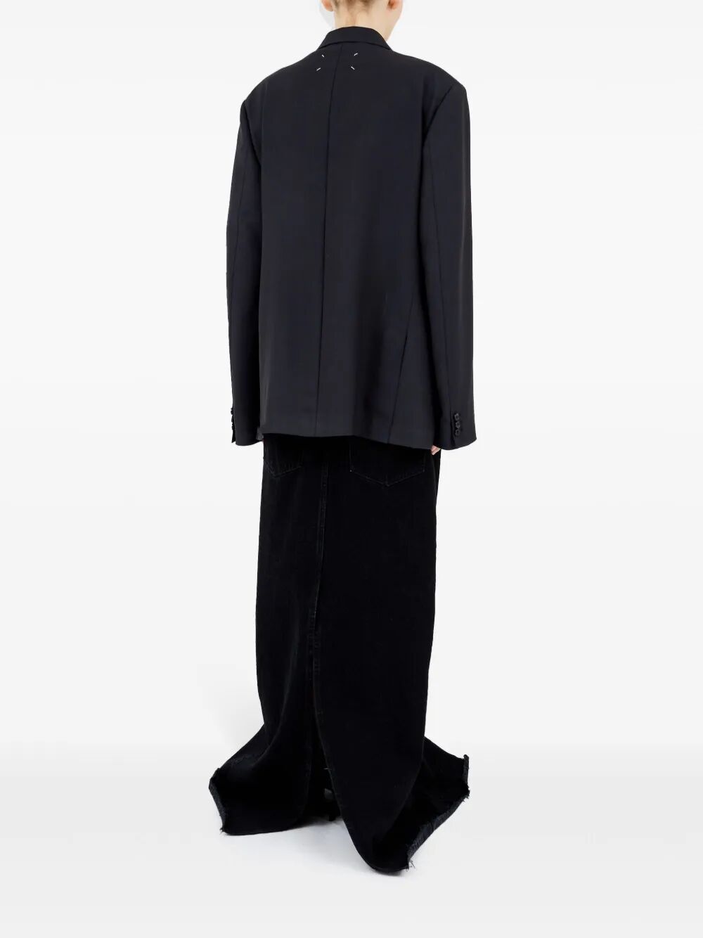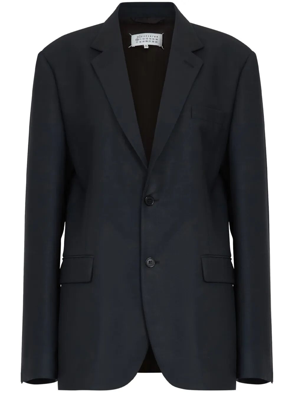 This single-breasted blazer, crafted from a luxurious mohair-wool blend, adds a touch of sophistication to any outfit. The sleek black design features a front button fastening, notched lapels, and buttoned cuffs for a refined look. With a chest welt pocket and two front flap pockets, this blazer is both stylish and functional.