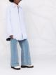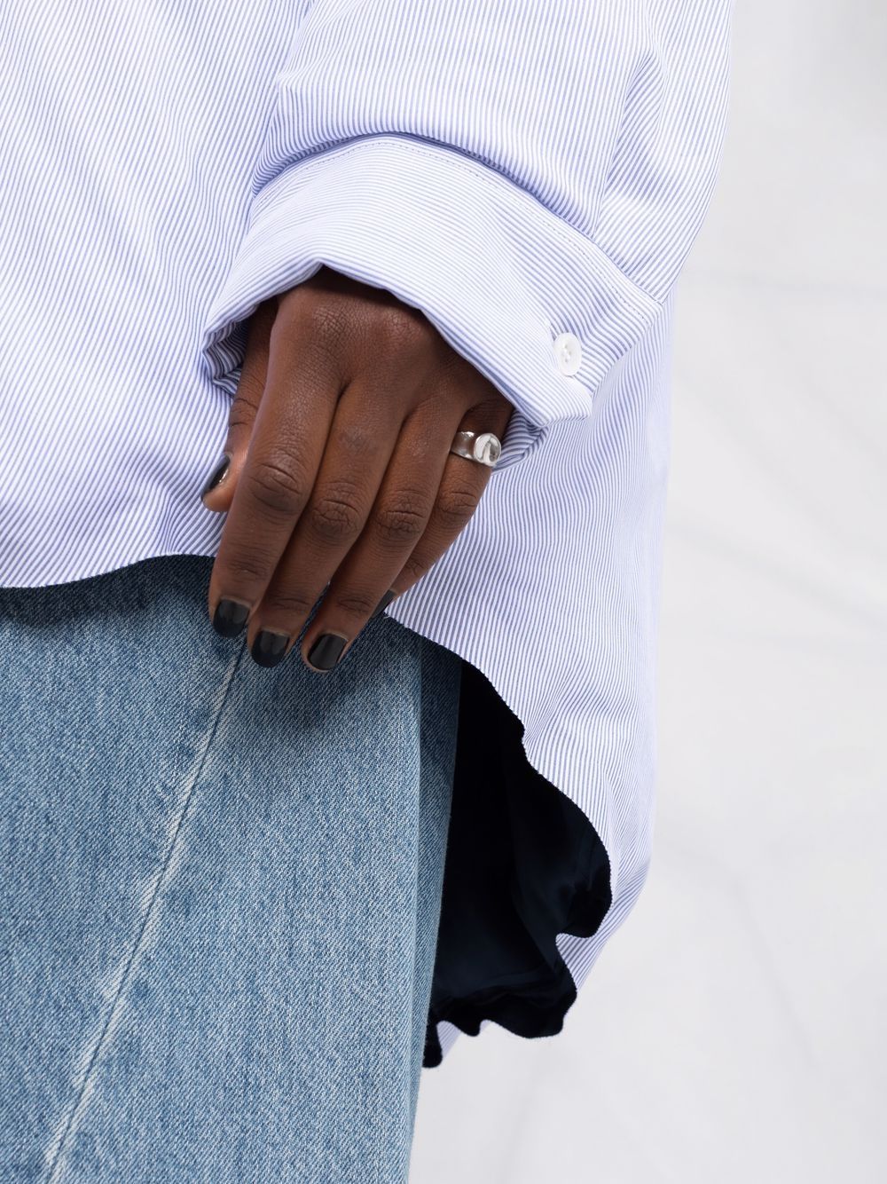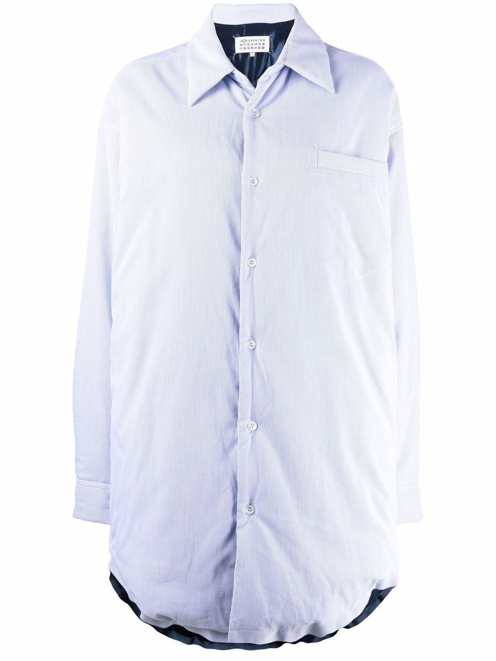 Stay effortlessly stylish with the Maison Margiela Striped Shirt Jacket. Made with light blue and white stripes and button closure, this jacket is sure to add a touch of sophistication to any outfit. Perfect for dressing up or down, this versatile piece is a must-have for any fashion-forward individual.